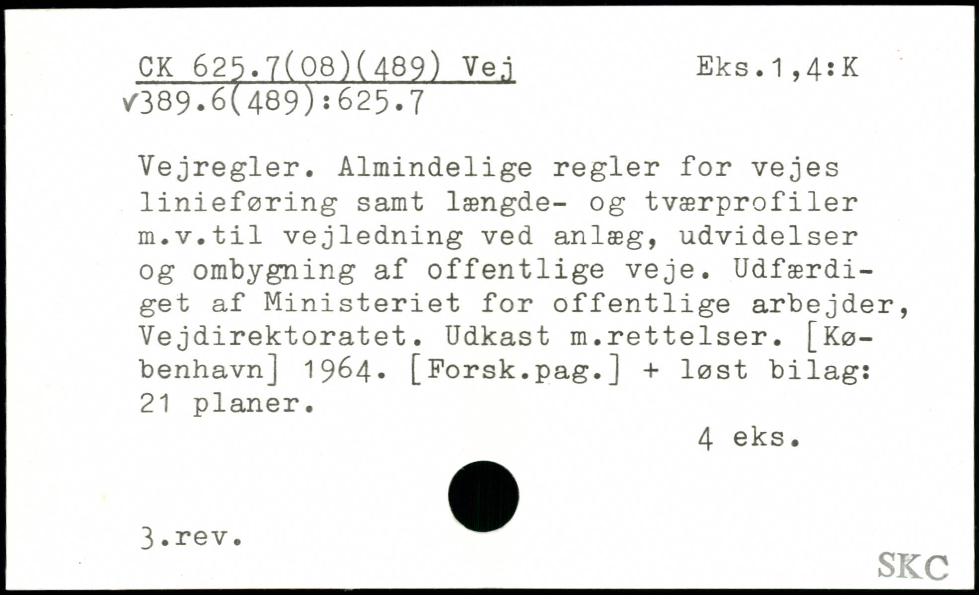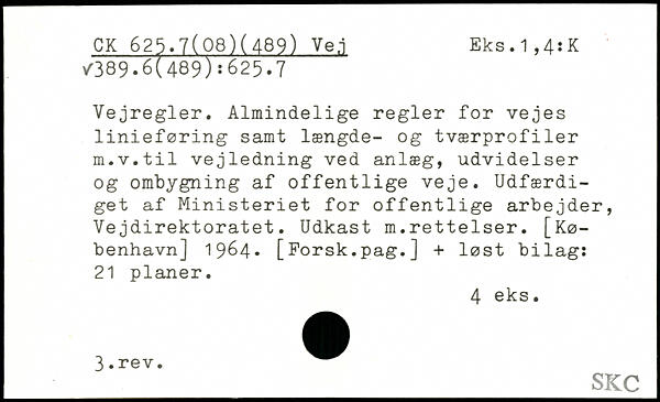Vejregler. Almindelige regler for vejes linieføring samt længde- og tværprofiler m.v.til vejledning ved anlæg, udvidelser og ombygning af offentlige veje. Udfærdiget af Ministeriet for offentlige arbejder, Vejdirektoratet. Udkast m.rettelser.