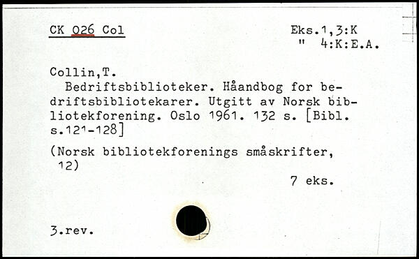 Bedriftsbiblioteker. Håandbog for be-driftsbibliotekarer. Utgitt av Norsk bib-liotekforening. Oslo 1961.