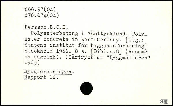Polyesterbetong i Västtyskland. Polyester concrete in West Germany, [ütg.: Statens institut för byggnadsforskningl