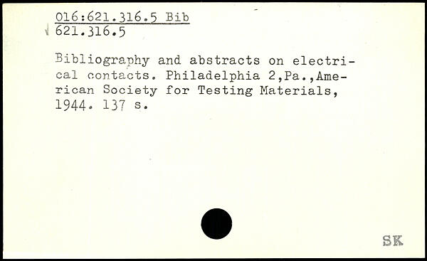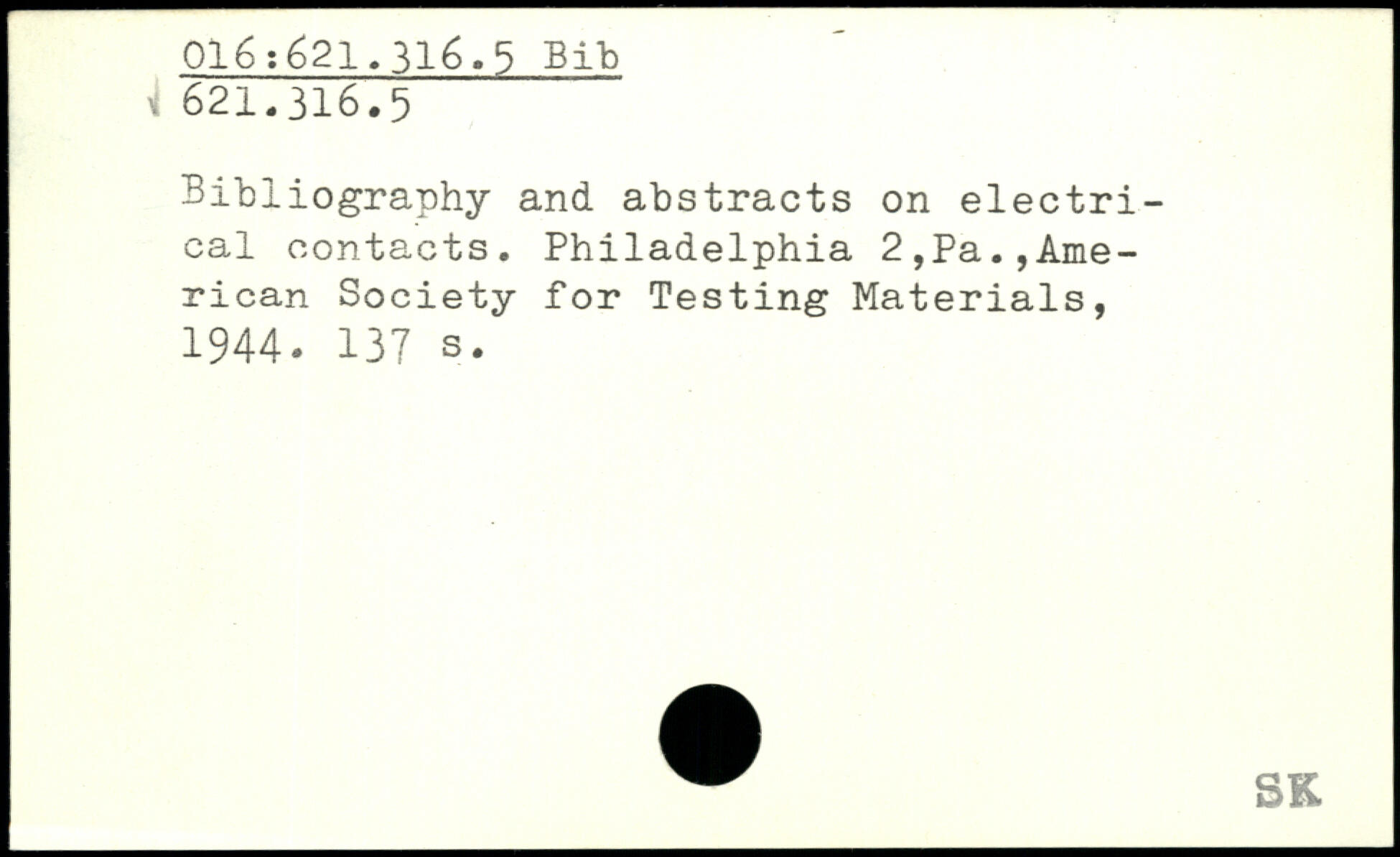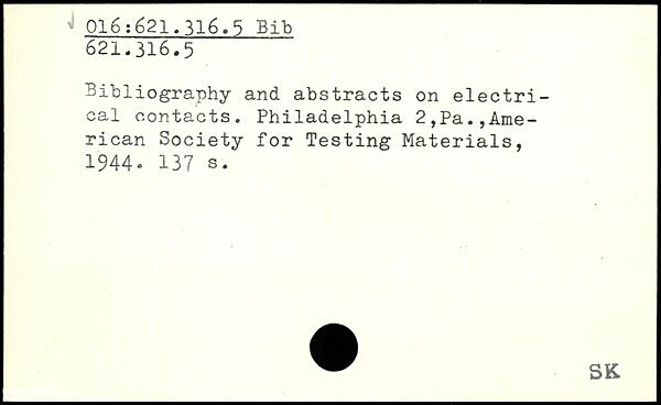 Bibliography and abstracts on electrical contacts. Philadelphia 2,Pa.,American Society for Testing Materials, 1944.