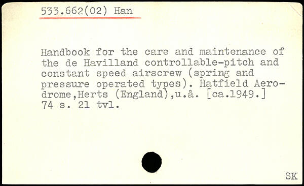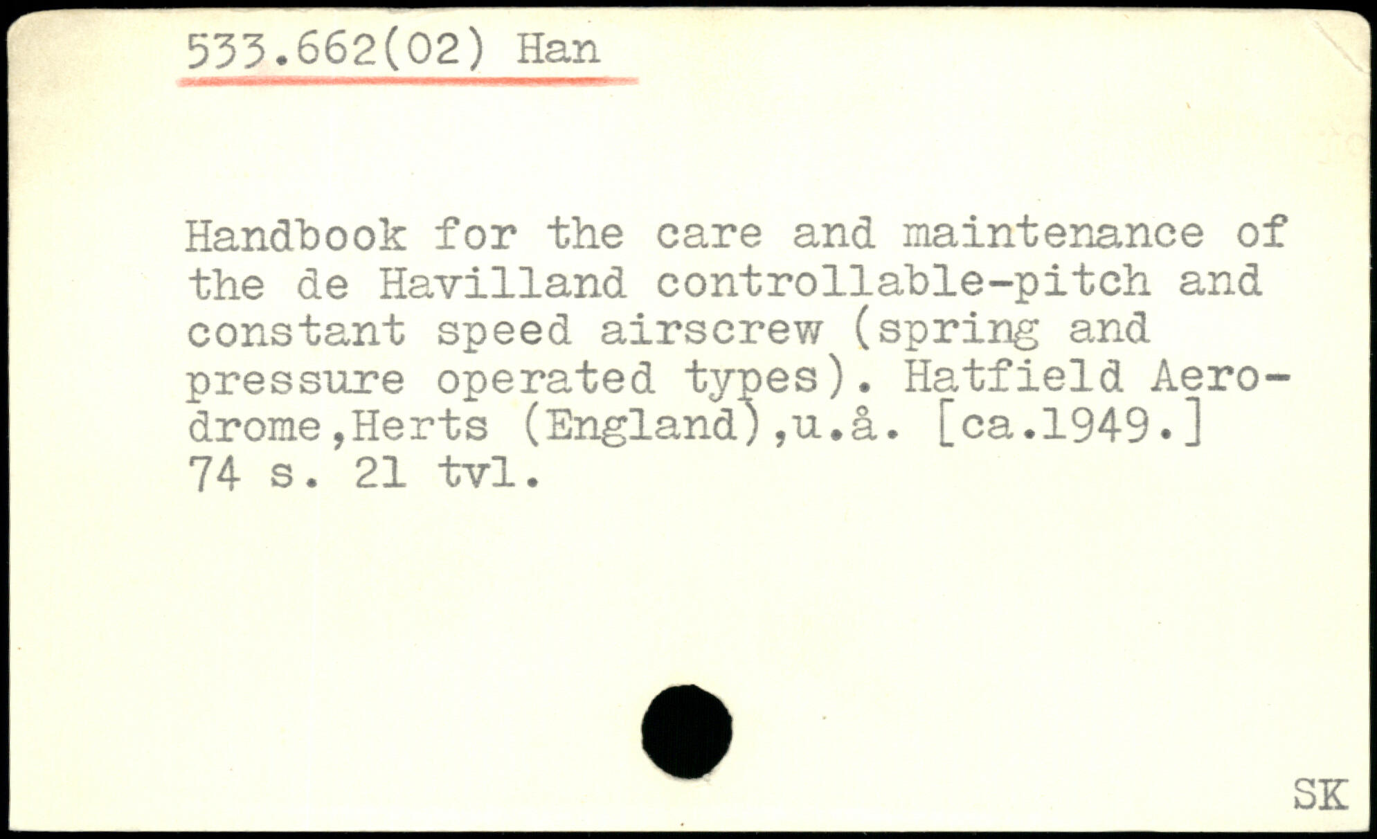 Handbook for the care and maintenance of the de Havilland controllable-pitch and constant speed airscrew (spring and pressure operated types). Hatfield Aerodrome,Herts (England),u.â. [ca.1949.]