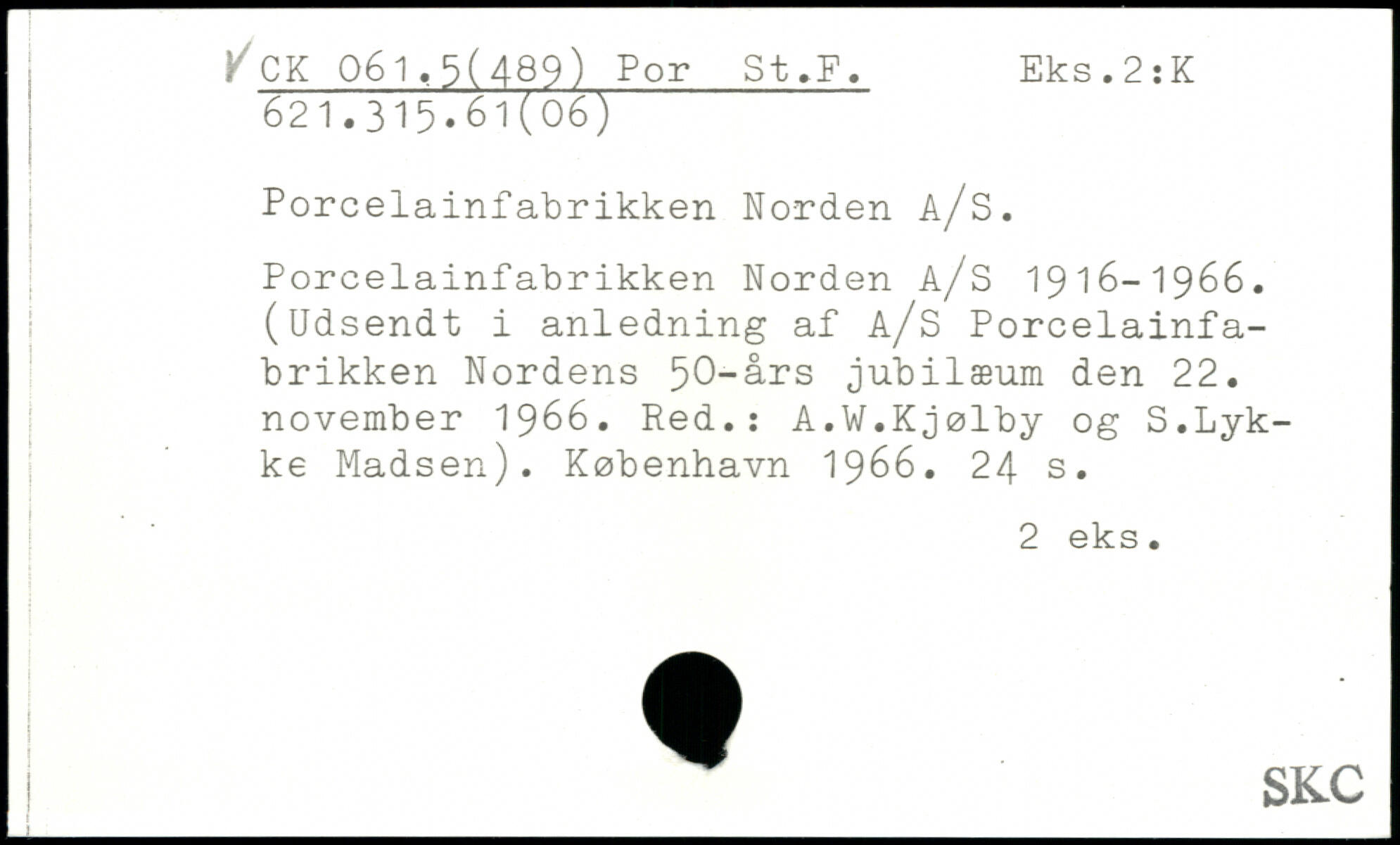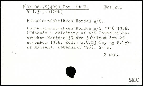 Porcelainfabrikken Norden å/S. Porcelainfabrikken Norden A/S 1916-1966. (Udsendt i anledning af A/S Porcelainfa-brikken Nordens ^0-å.rs jubilæum den 22. november 1966. Red.: A.W.Kjølby og S.Lykke Madsen).