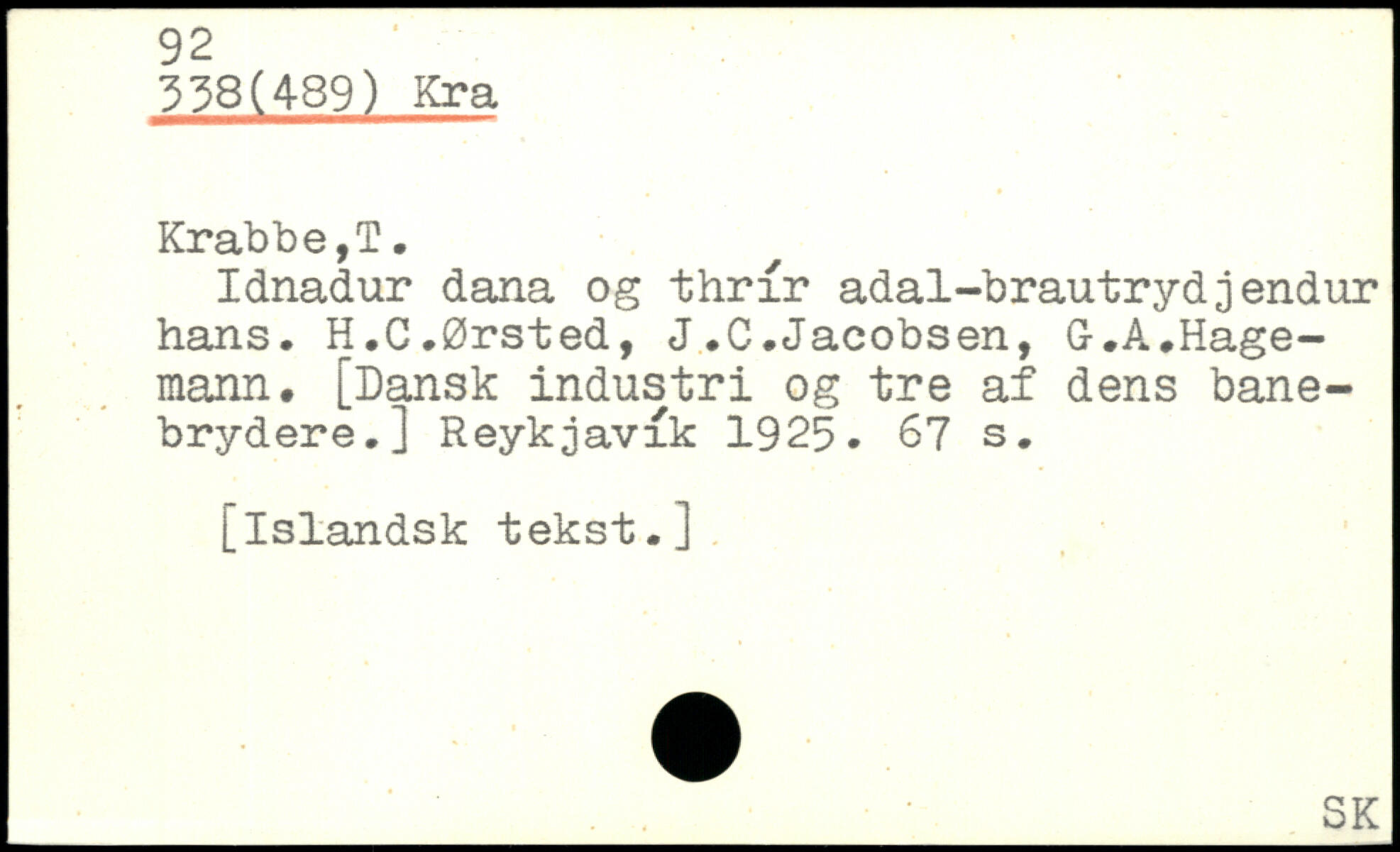 Idnadur dana og i: hr ir adal-brautrydjendur hans. H.C.Ørsted, J.C.Jacobsen, G.A.Hage-mann. [Dansk industri og tre af dens banebrydere.] Reykjavik 1925.