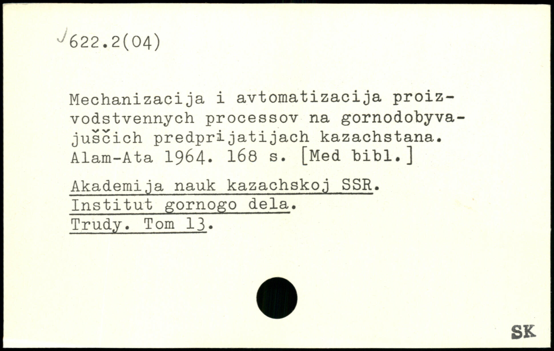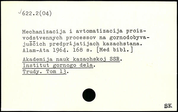 Mechanizacija i avtomatizacija proiz-vodstvennych processov na gornodobyva-juscich predprijatijach kazachstana. Alam-Ata 1964.