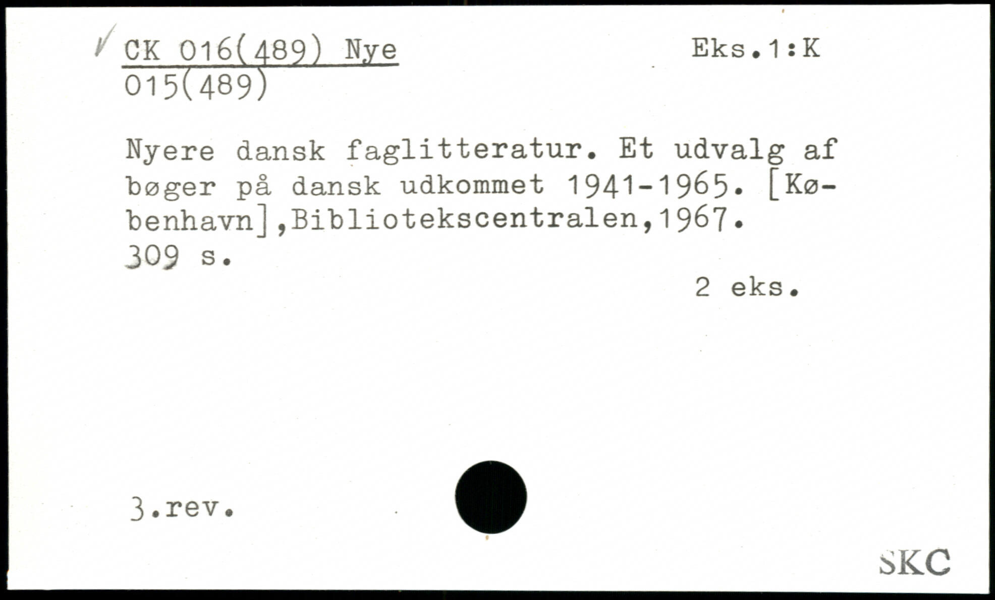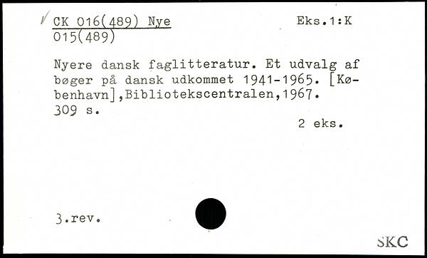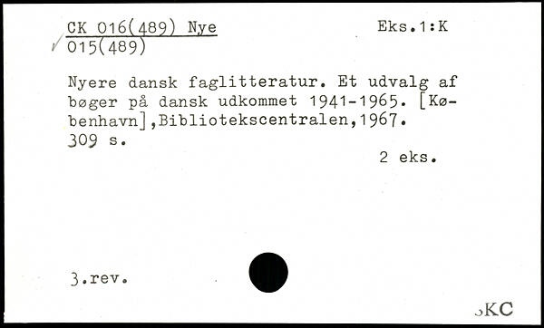 Nyere dansk faglitteratur. Et udvalg af bøger på dansk udkommet 1941-1965, [København] ,Bibliotekscentralen,1967.