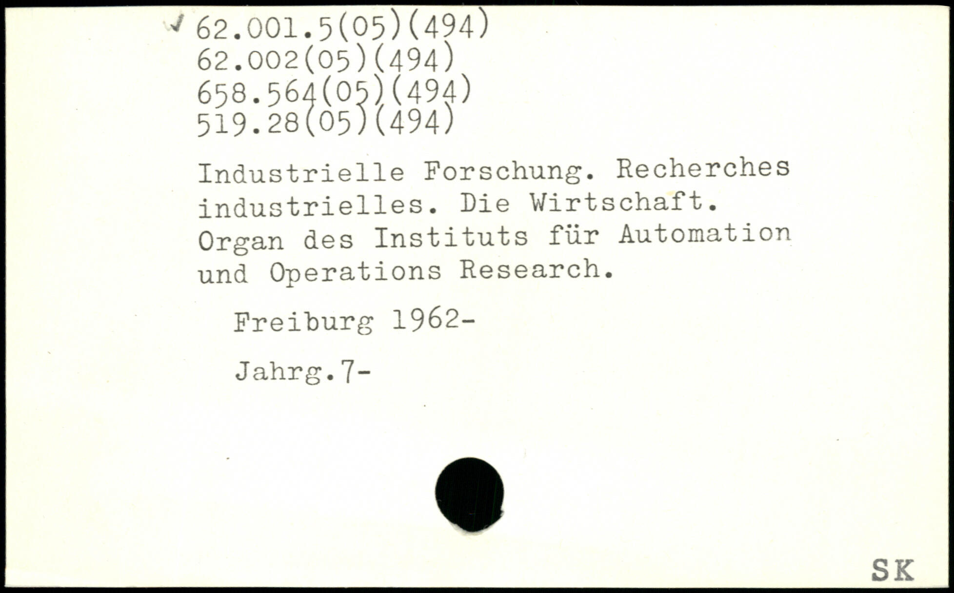 Industrielle Forschung. Hecherches industrielles. Die Wirtschaft. Organ des Instituts für Automation und Operations Research. Freihurg 1962- Jahrg.7-