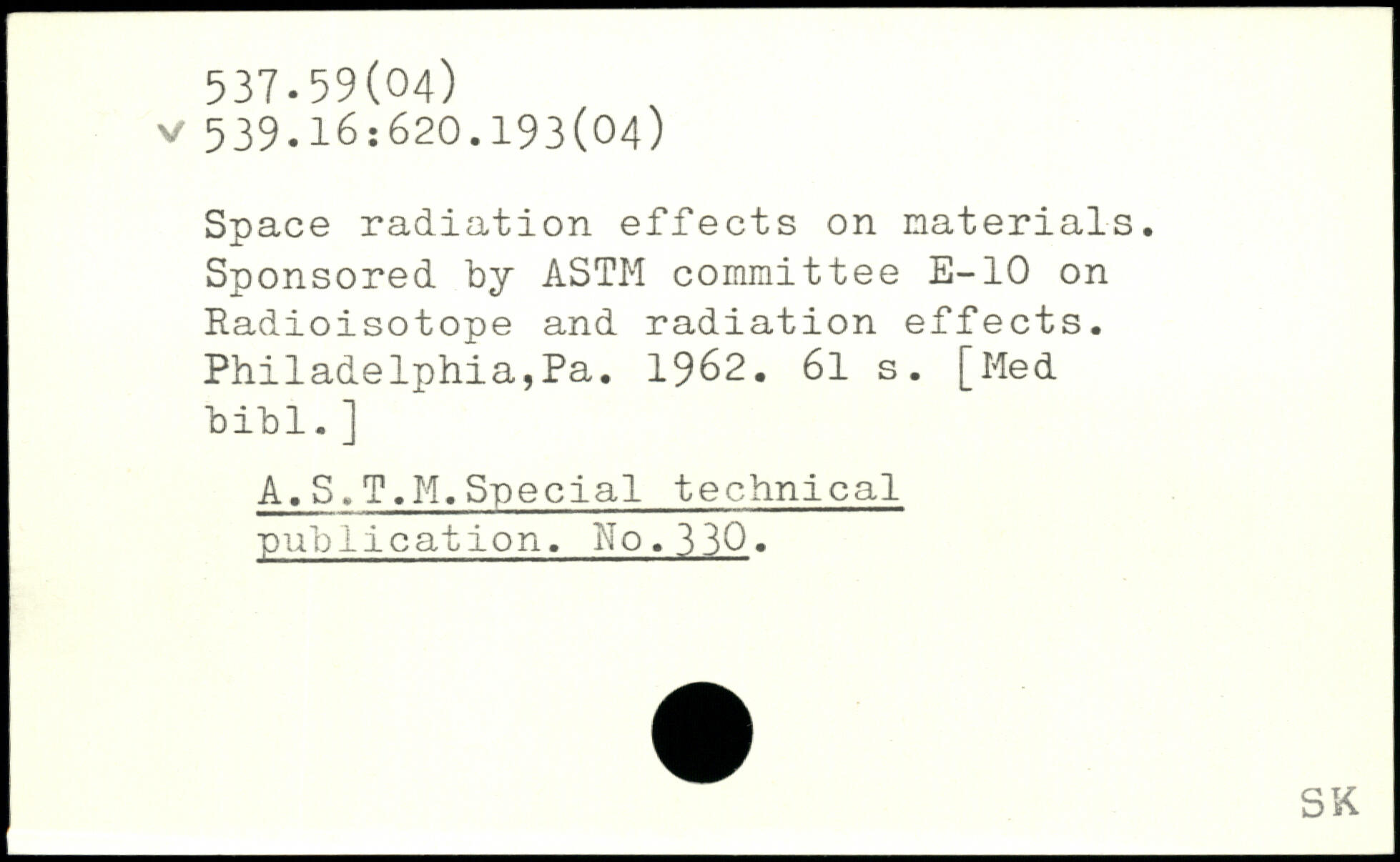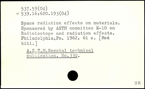 Space radiation effects on materials. Sponsored by ASTM committee E-10 on Radioisotope and radiation effects. Philadelphia,Pa. 1962.