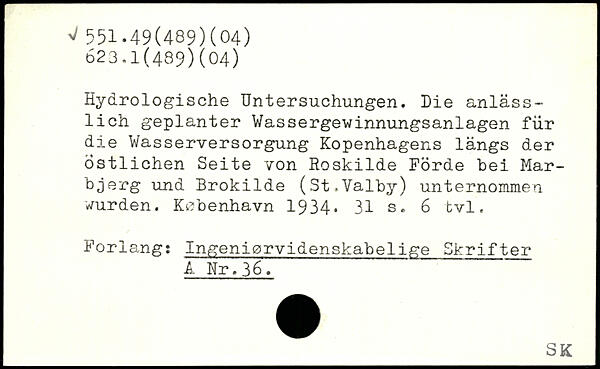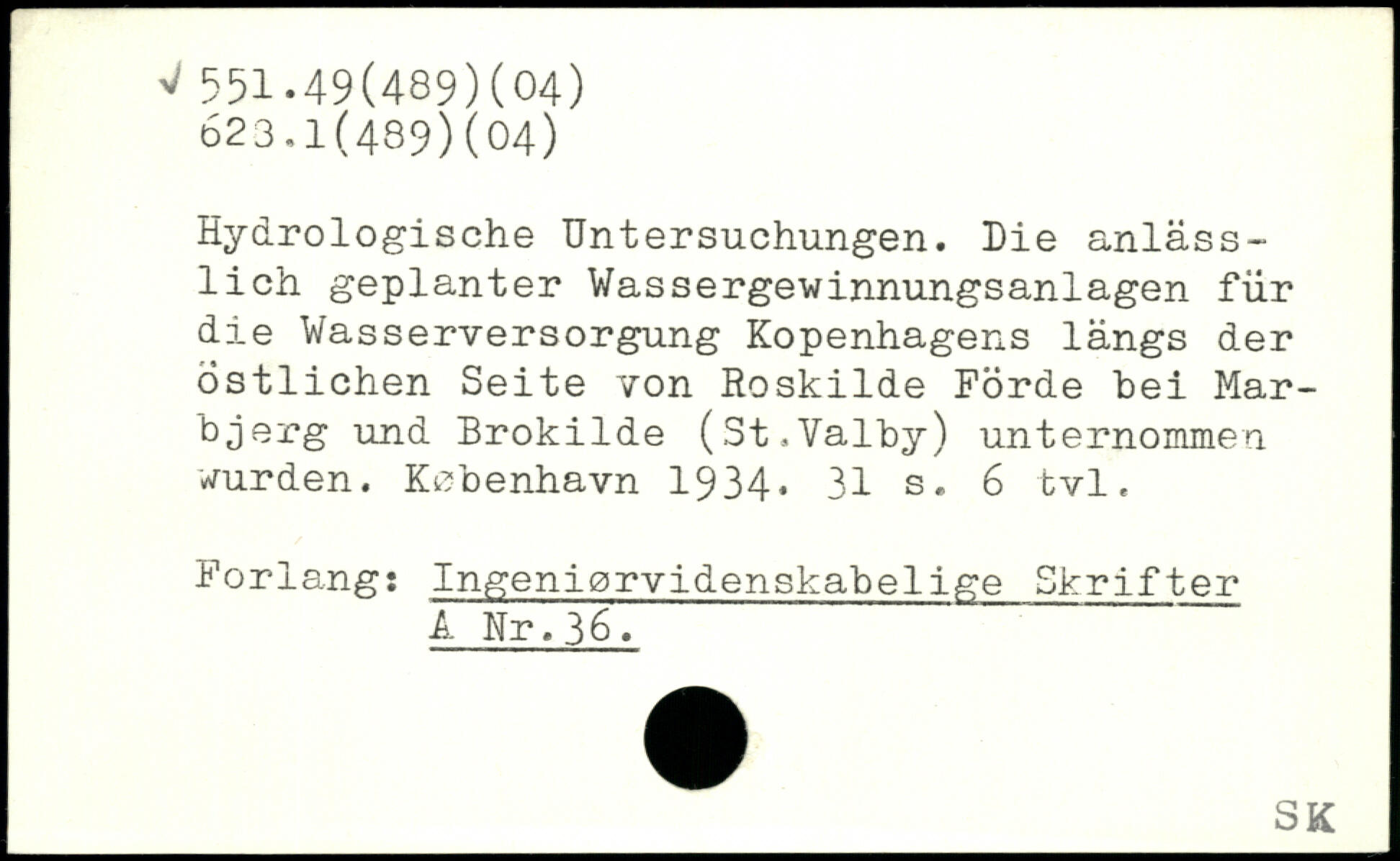 Hydrologische Untersuchungen. Die anlässlich geplanter Wassergewinnungsanlagen für die Wasserversorgung Kopenhagens längs der östlichen Seite von Roskilde Förde bei Marti jerg und Brokilde (St,Valby) unternommen wurden. Kobenhavn 1934.