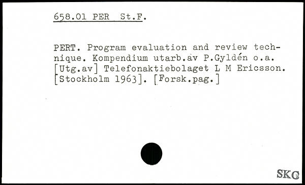 PERT. Program evaluation and review technique. Kompendium utarb.av P.Gylden o.a. Utg.av] Telefonaktiebolaget L M Ericsson. ’