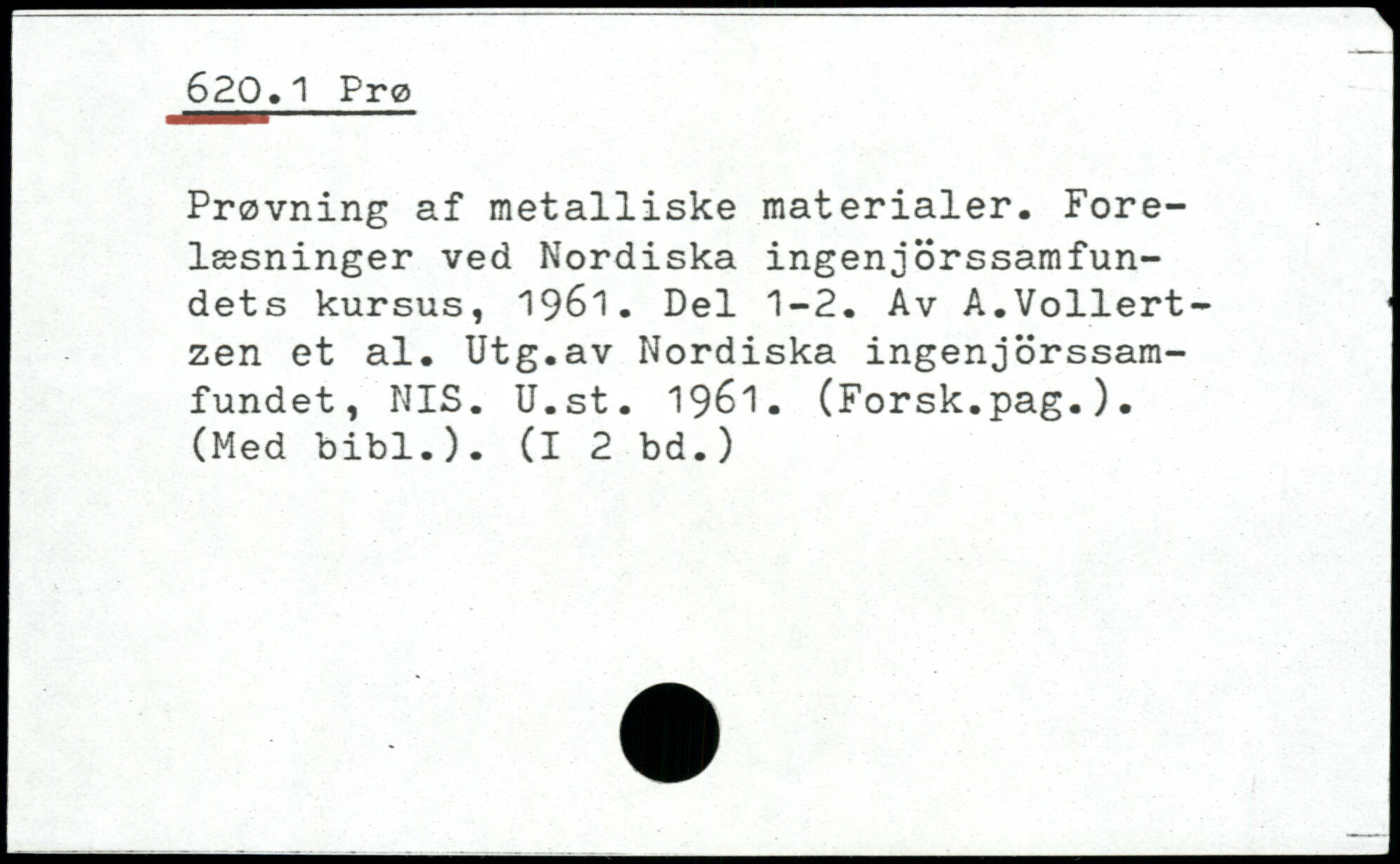 Prøvning af metalliske materialer. Forelæsninger ved Nordiska ingenjorssamfun-dets kursus, 1961. Del 1-2. Av A.Vollert-zen et al. Utg.av Nordiska ingenjorssam-fundet, NIS. U.st. 1961. (Forsk.pag.). (Med bibl.). (I 2 bd.)
