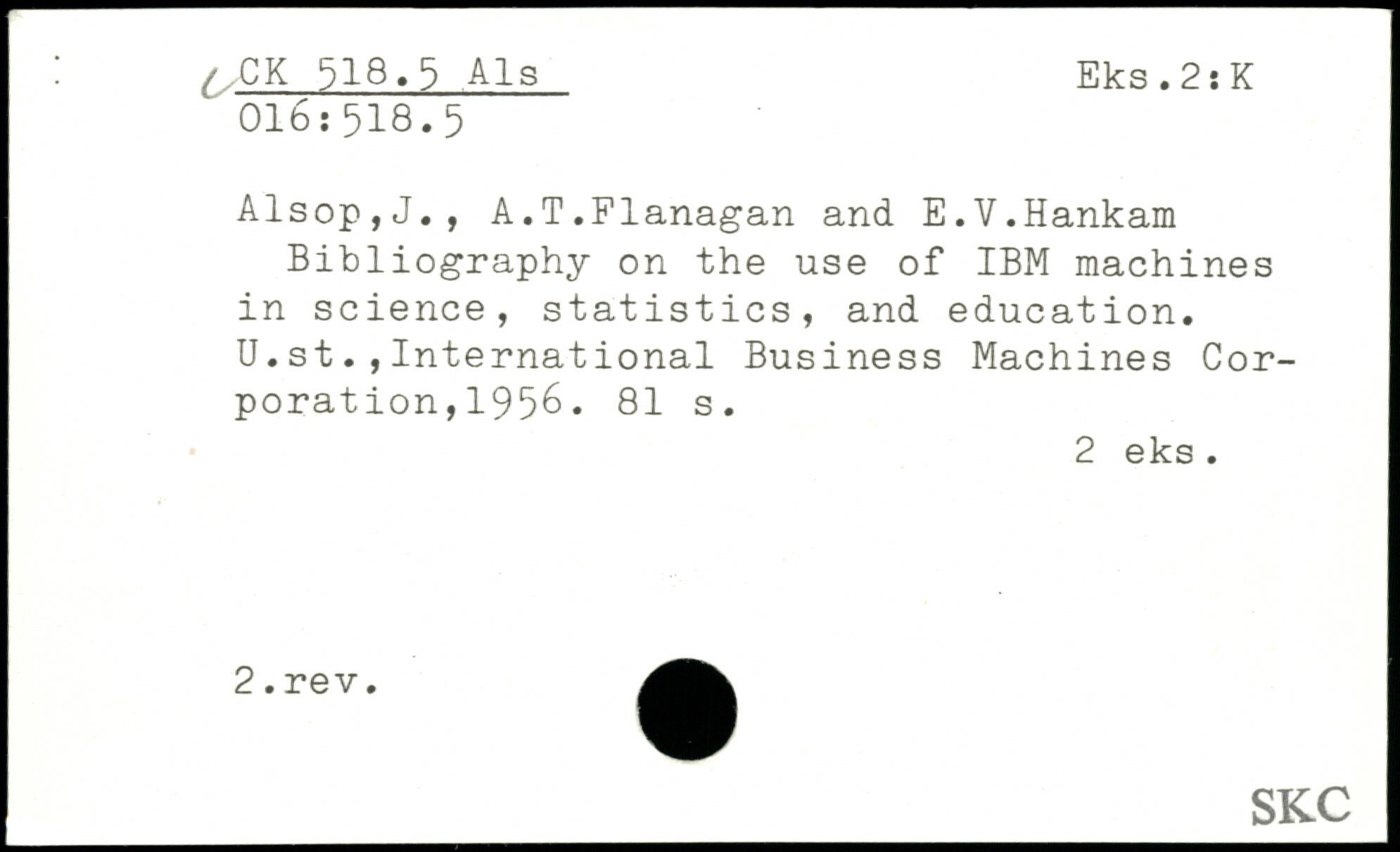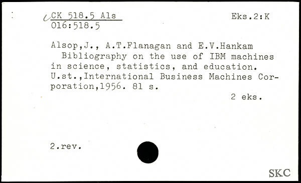 Alsop,J., A.T.Flanagan and E.V.Hankam Bibliography on the use of IBM machines in science, statistics, and education. U.st.,International Business Machines Corporation ,1956.