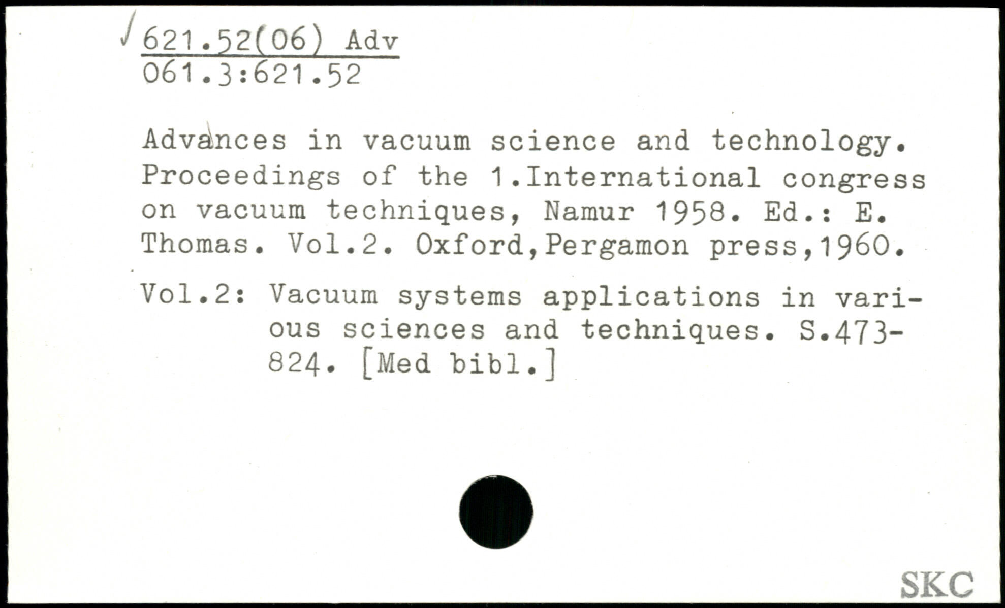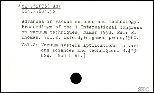 Advances in vacuum science and technology. Proceedings of the 1.International congress on vacuum techniques, Namur 1958. Ed.: E. Thomas.