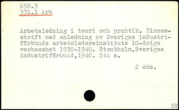 Arbetsledning i teori och praktik. Minnesskrift med anledning av Sveriges industriförbunds arbetsledareinstituts 10-åriga verksamhet 1930-1940.