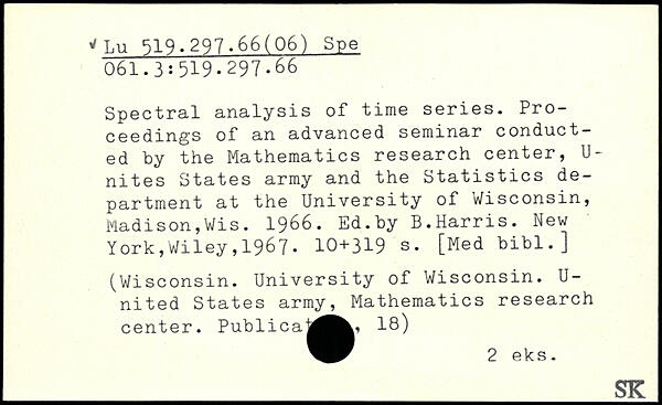 Spectral analysis of time series. Proceedings of an advanced seminar conducted by the Mathematics research center, U-nites States army and the Statistics department at the University of Wisconsin, Madison,Wis. 1966. Ed.by B.Harris.