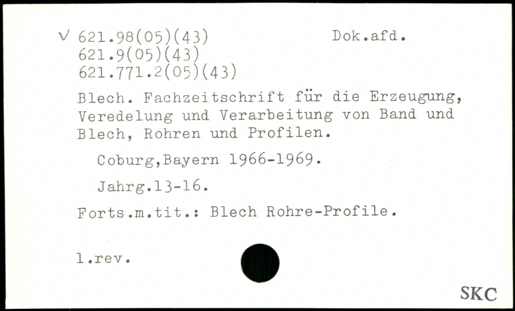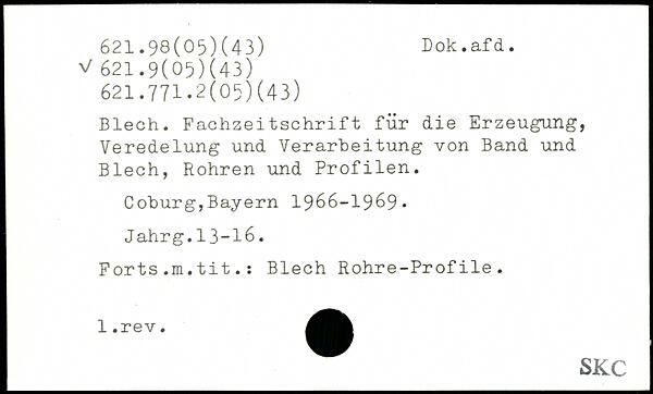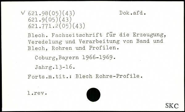 Blech. Fachzeitschrift für die Erzeugung, Veredelung und Verarbeitung von Band und Blech, Rohren und Profilen. Coburg,Bayern 1966-1969. Jahrg.13-16. Forts.m.tit.: Blech Rohre-Profile.