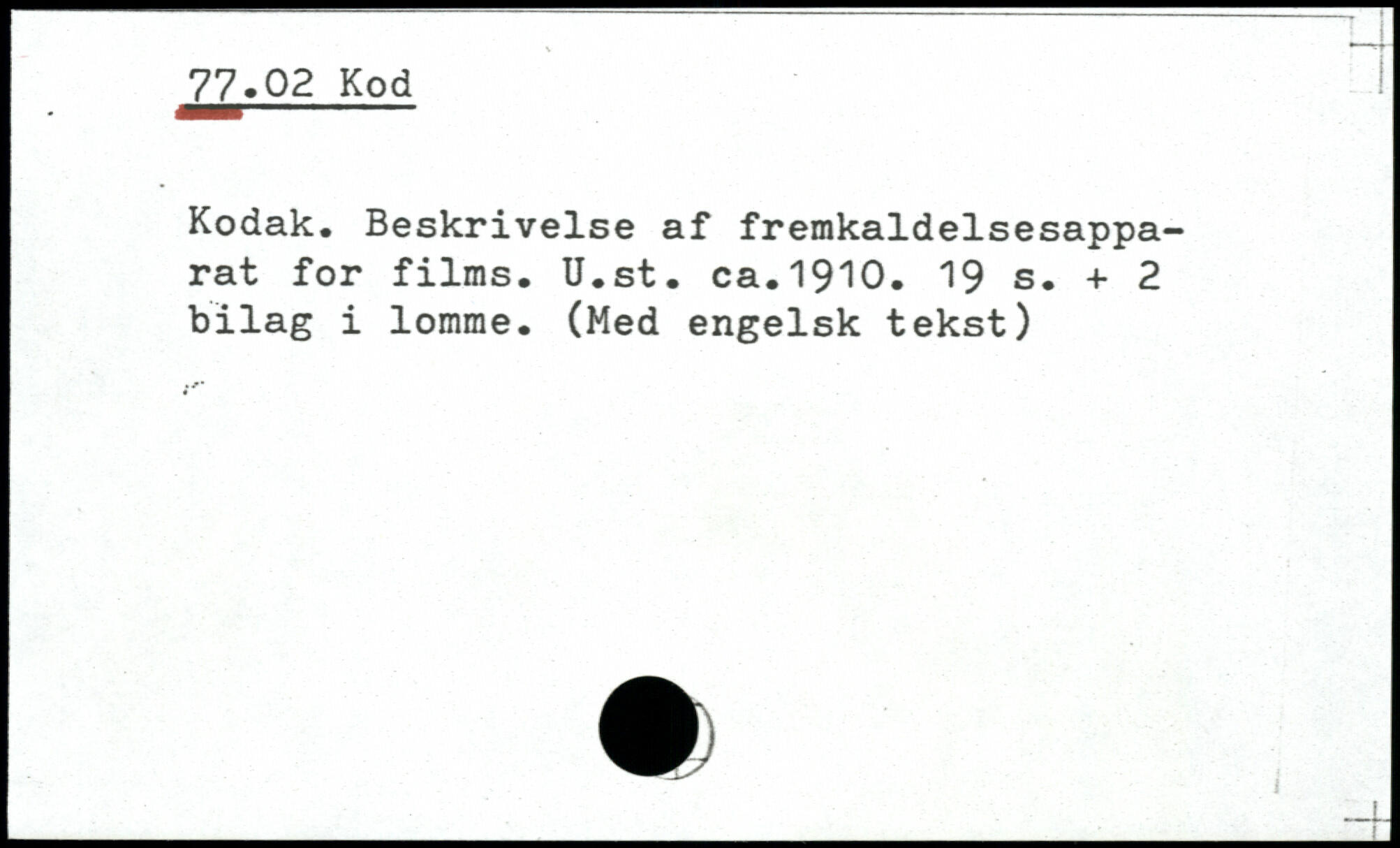 Kodak. Beskrivelse af fremkaldelsesappa-rat for films. U.st. ca.1910.