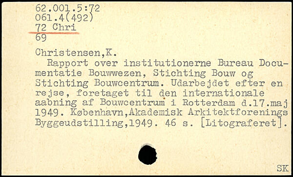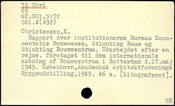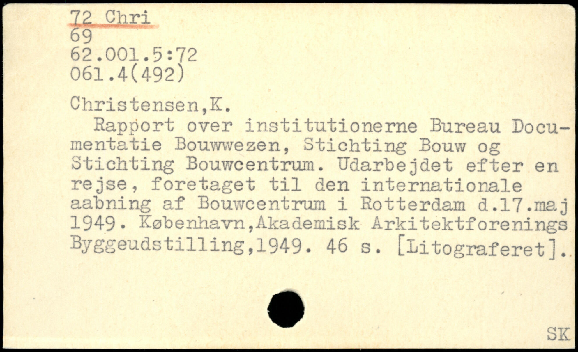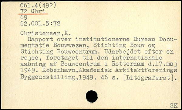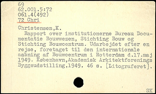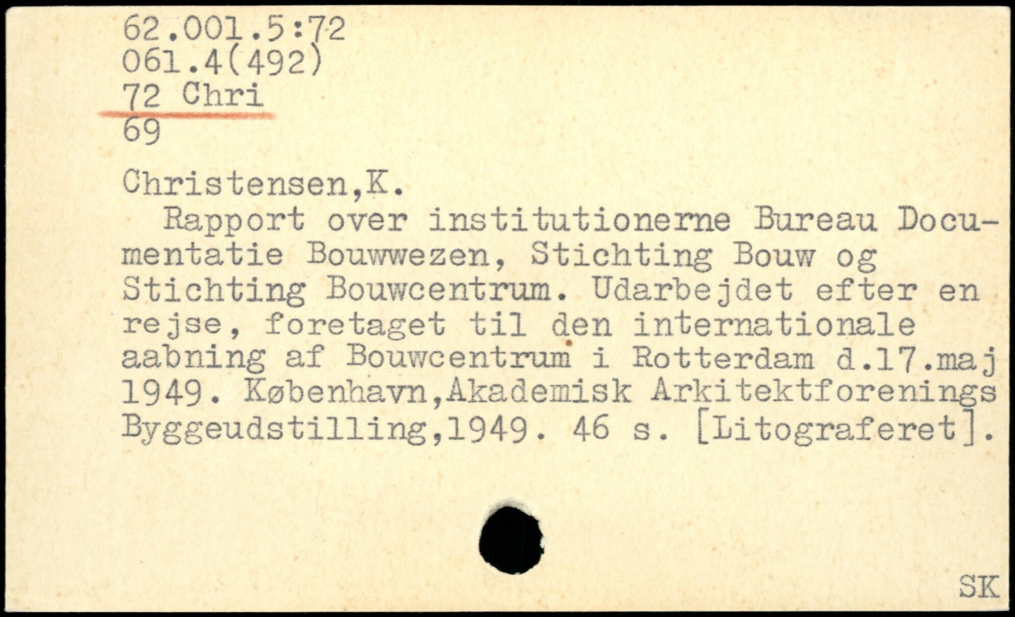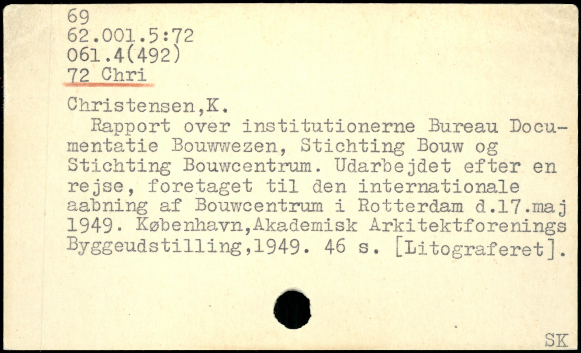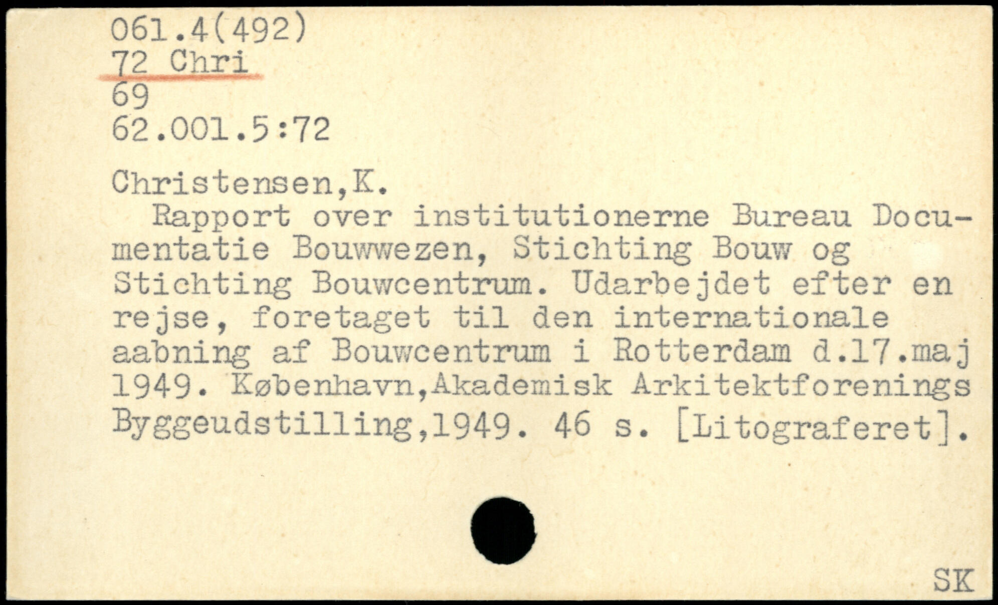 Rapport over institutionerne Bureau Docu-mentatie Bouwwezen, Stichting Bouw og Stichting Bouwcentrum. Udarbejdet efter en rejse, foretaget til den internationale aabning af Bouwcentrum i Rotterdam d.17.maj 1949. København,Akademisk Arkitektforenings Byggeudst1111ng,1949.