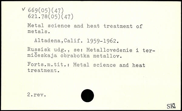 Metal science and heat treatment of metals. Altadena,Calif. 1959-1962. Russisk udg. , se: Metallovedenie i ter-miceskaja obrabotka metallov. Forts.m.tit.: Metal science and heat treatment. _s&