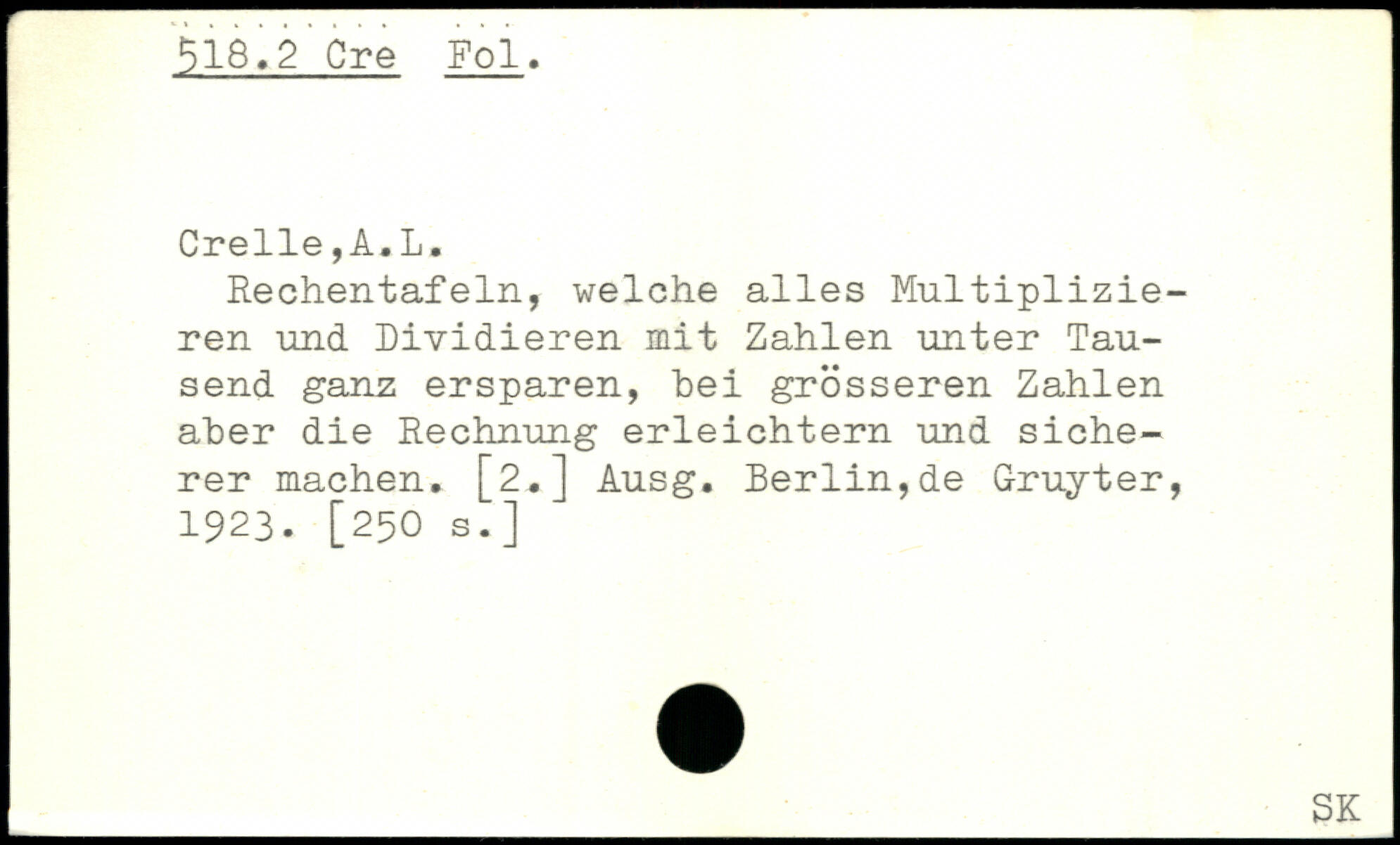Rechentafeln, welche alles Multiplizieren und Dividieren mit Zahlen unter Tausend ganz ersparen, bei grösseren Zahlen aber die Rechnung erleichtern und sicherer machen. [2.] Ausg. Berlin,de Gruyter, 1923. [25O s.]