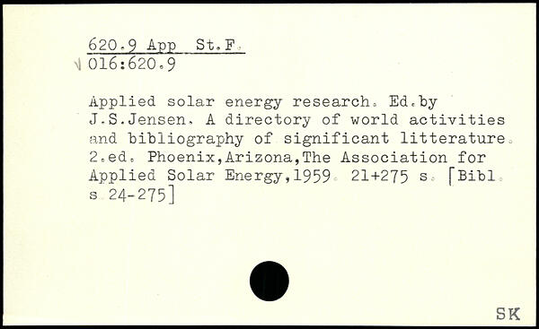 Applied solar energy research. Eddy J.S.Jensen. A directory of world activities and bibliography of significant litterature. 2=ed= Phoenix,Arizona,The Association for Applied Solar Energy,1959-