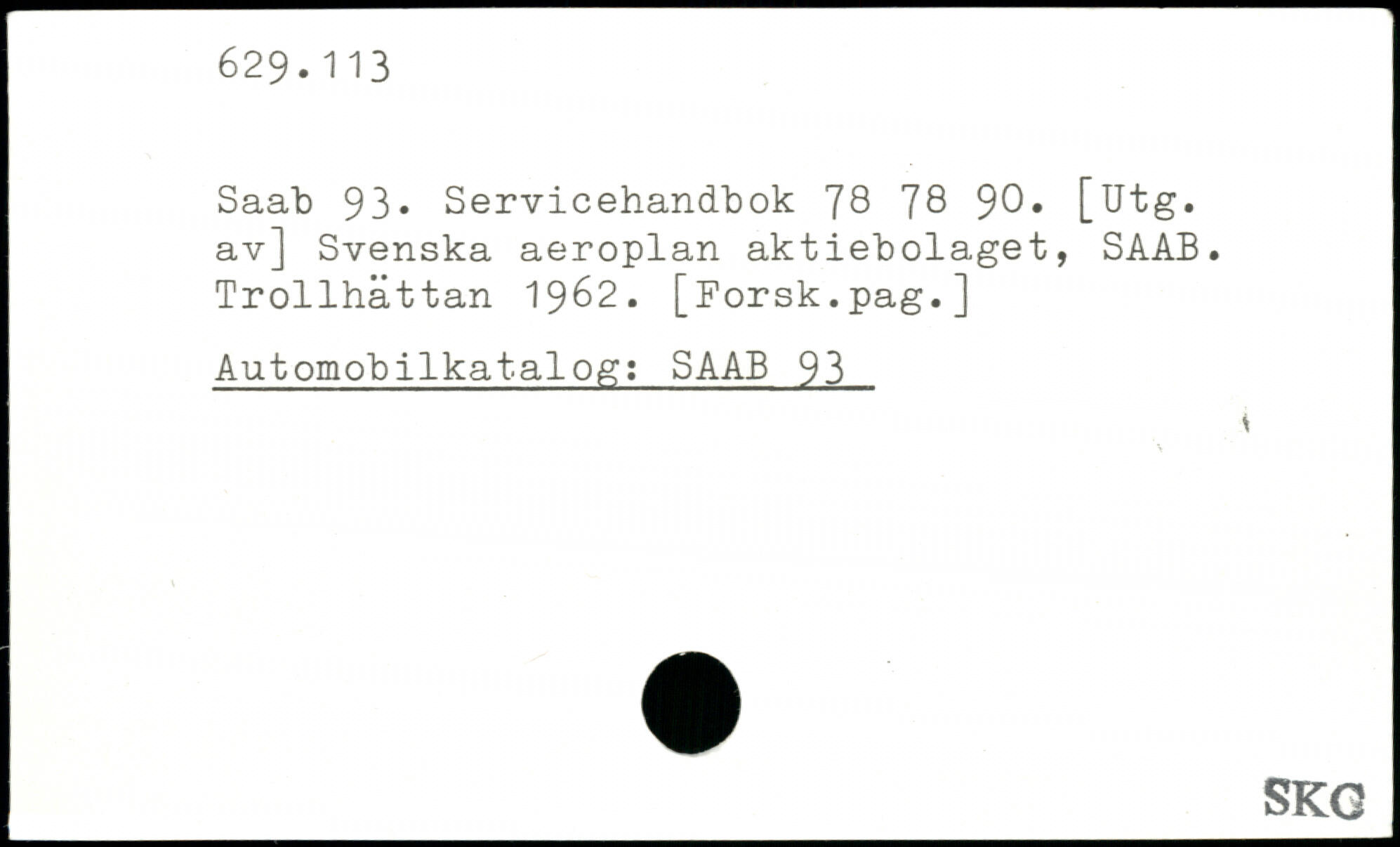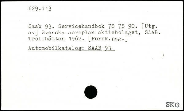 Saab 93, Servicehandbok J8 78 JO. [Utg. av] Svenska aeroplan aktiebolaget, SAAB. Trollhättan 1962. [Forsk.pag.] Automobilkatalog: SAAB 93