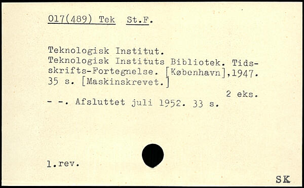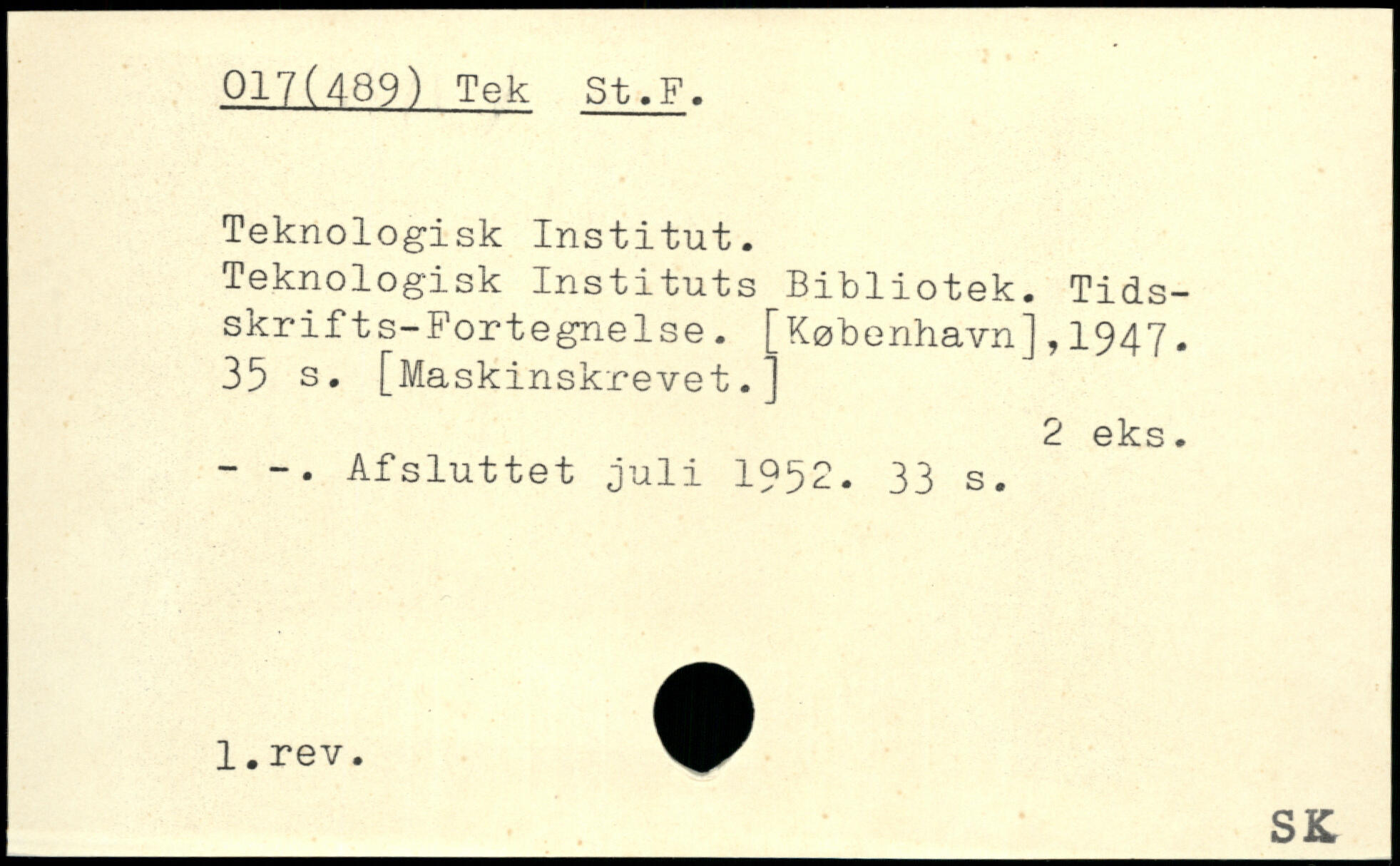 Teknologisk Institut. Teknologisk Instituts Bibliotek. Tidsskrifts-Fortegnelse.