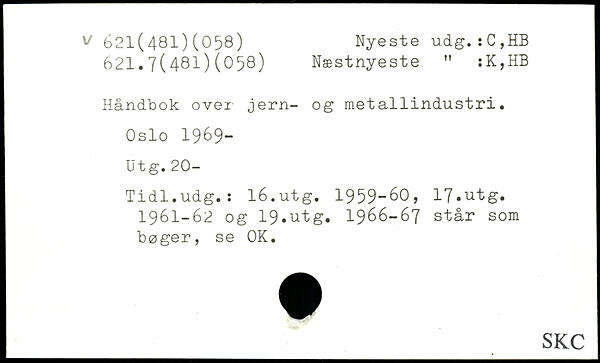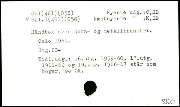 Håndbok over jern- og metallindustri. Oslo 1969- Utg.20- Tidl.udg.: 16.utg. 1959-60, 17.utg. 1961-62 og 19.utg. 1966-