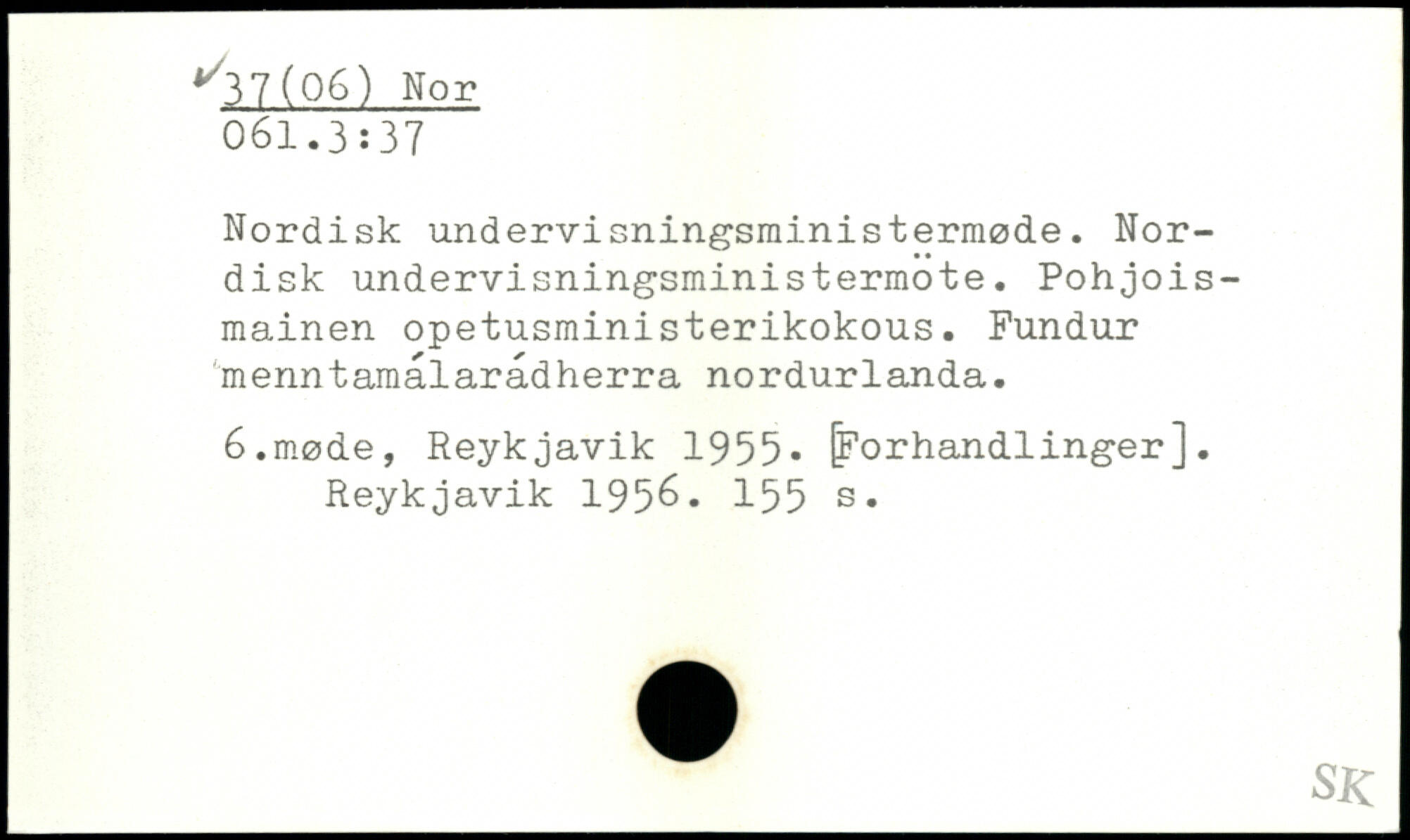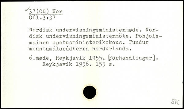 Nordisk undervisningsministermøde. Nordisk undervisningsministermote. Pohjois-mainen opetusministerikokous. Fundur 'menntamålaradherra nordurlanda. 6.møde, Reykjavik 1955. [Forhandlinger]. Reykjavik 1956.