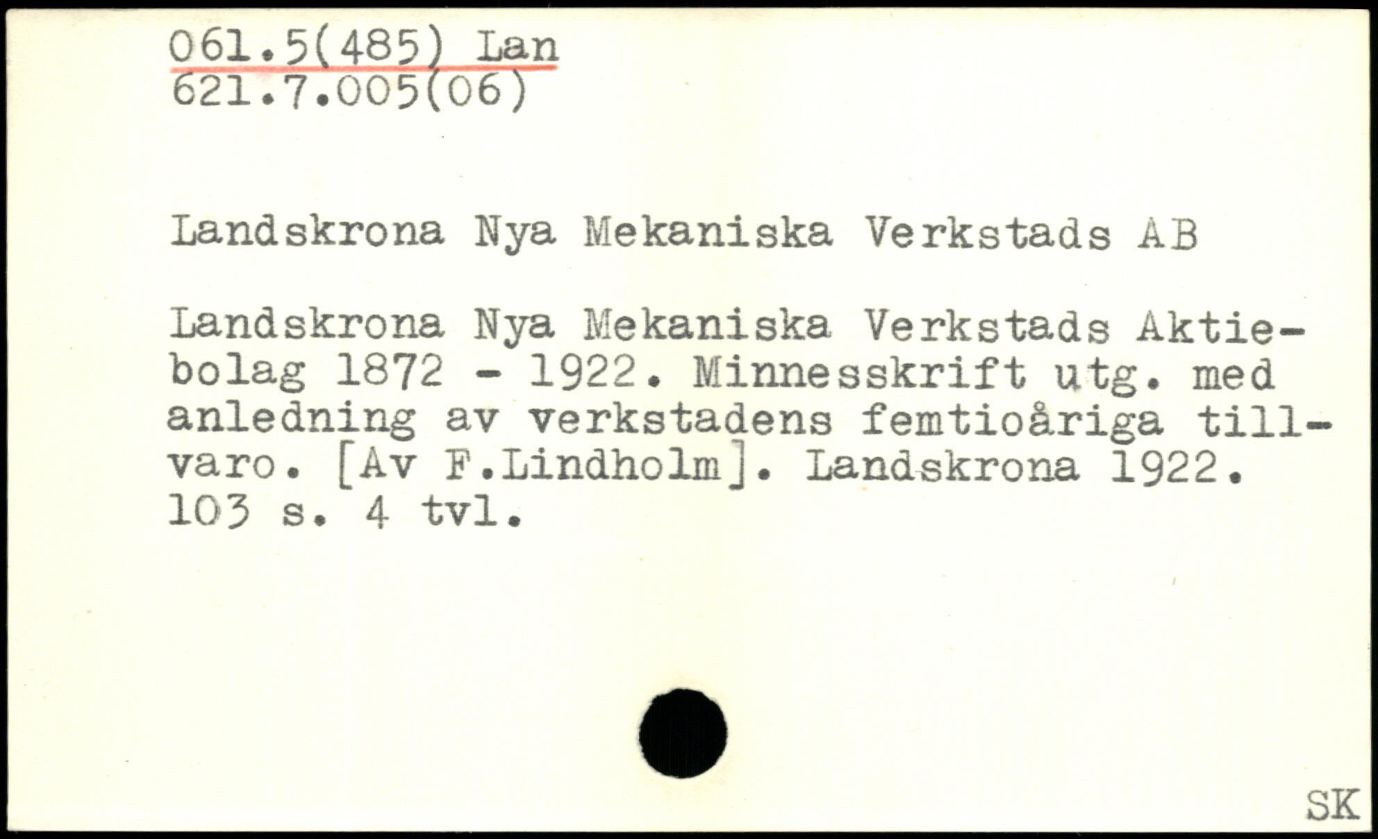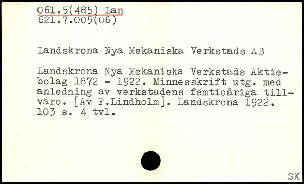 Landskrona Nya Mekaniska Verkstads ÅB Landskrona Nya Mekaniska Verkstads Aktiebolag 1872 - 1922. Minnesskrift utg. med anledning av verkstadens femtioåriga tillvaro. [Av B.Lindholm]. Landskrona 1922.