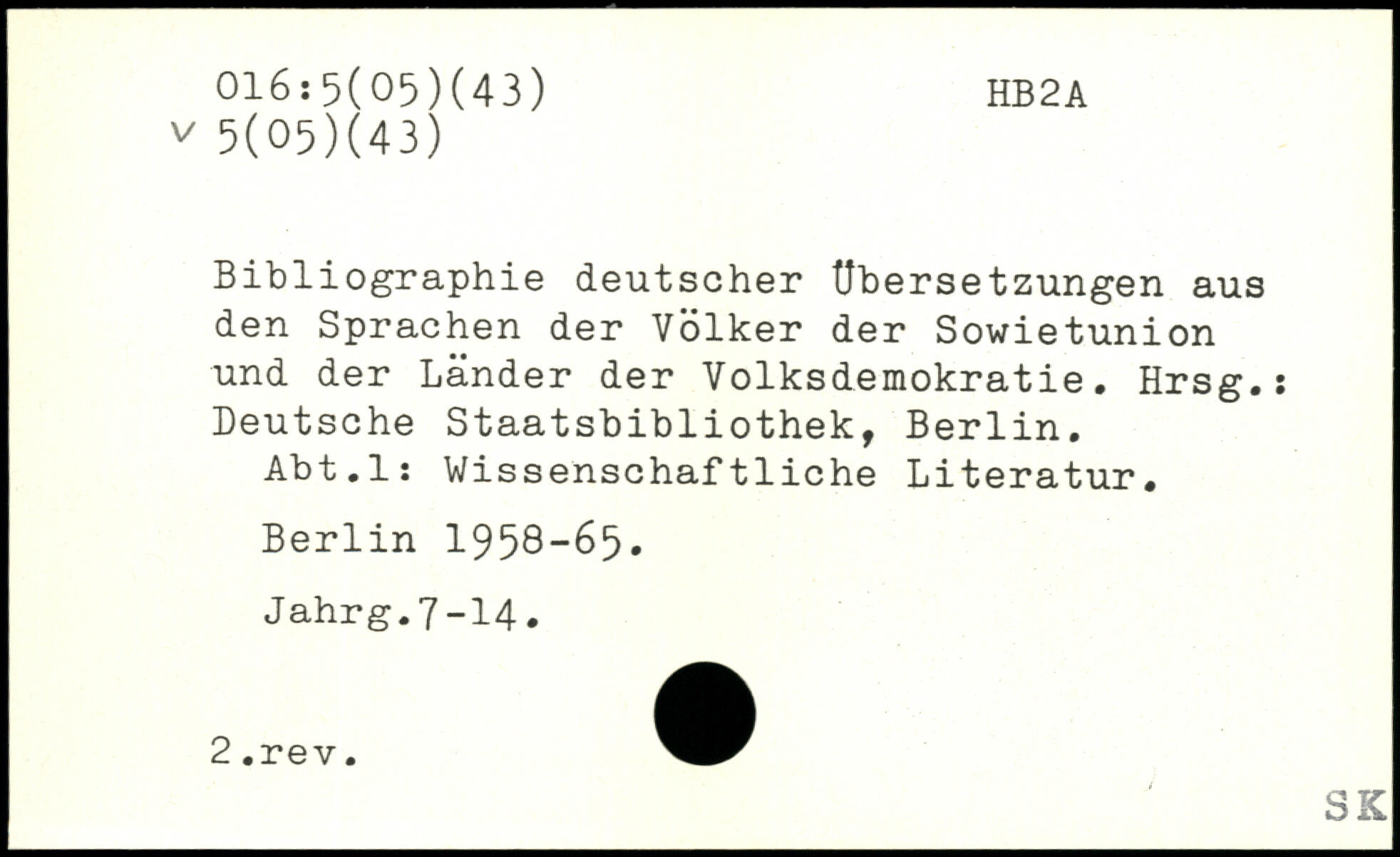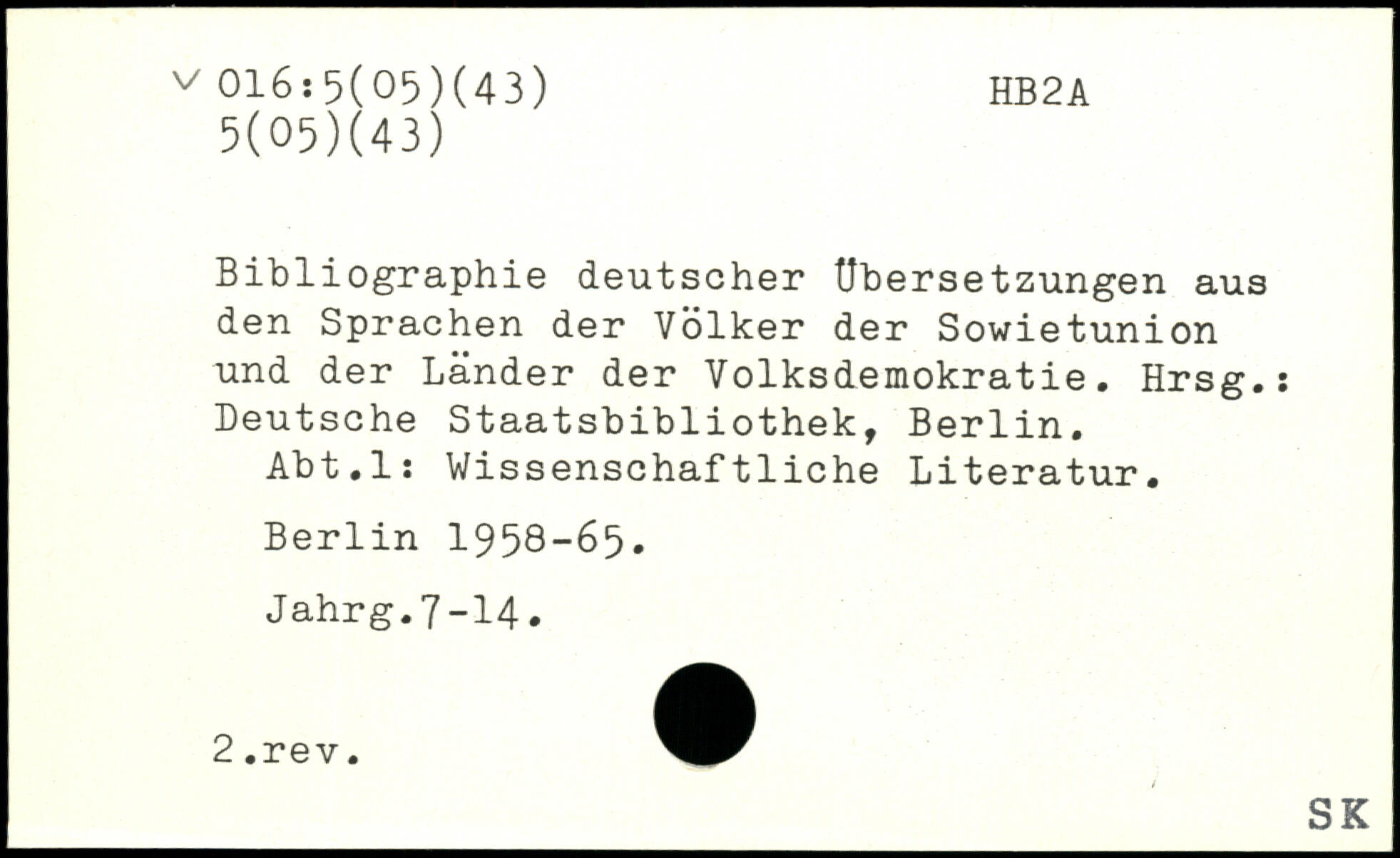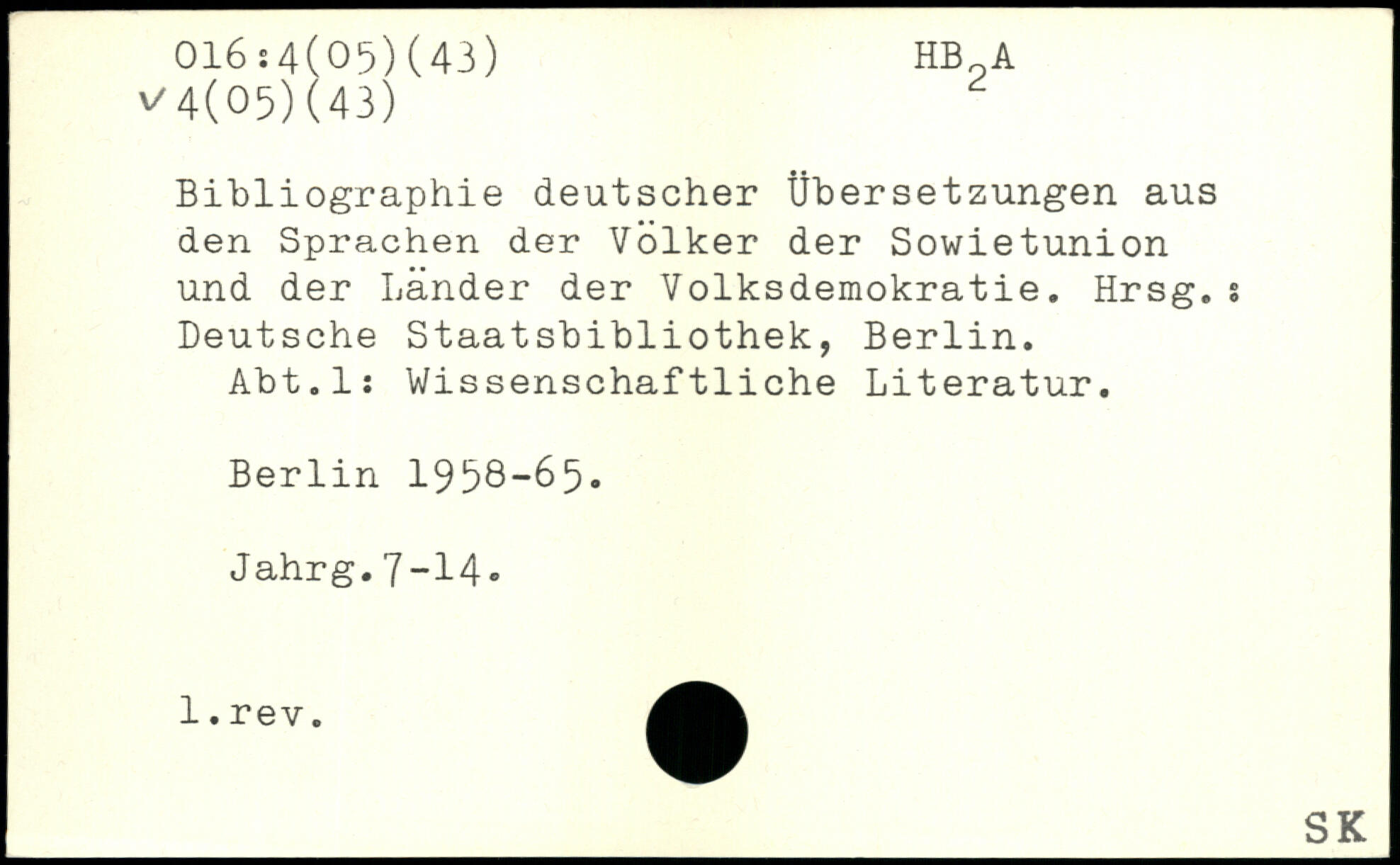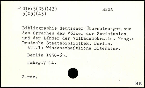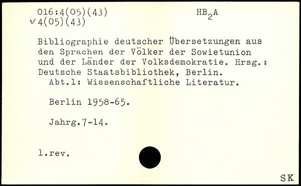 Bibliographie deutscher Übersetzungen aus den Sprachen der Völker der Sowietunion und der Länder der Volksdemokratie. Hrsg.s Deutsche Staatsbibliothek, Berlin. Abt.l: Wissenschaftliche Literatur.