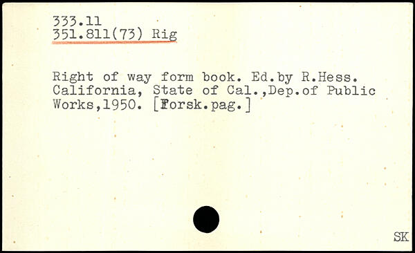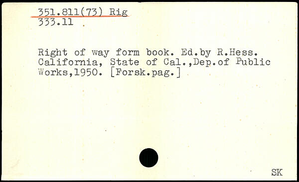 Right of way form book. Ed.by R.Hess. California, State of Cal.,Dep.of Public Works,1950. [Forsk.pag.]