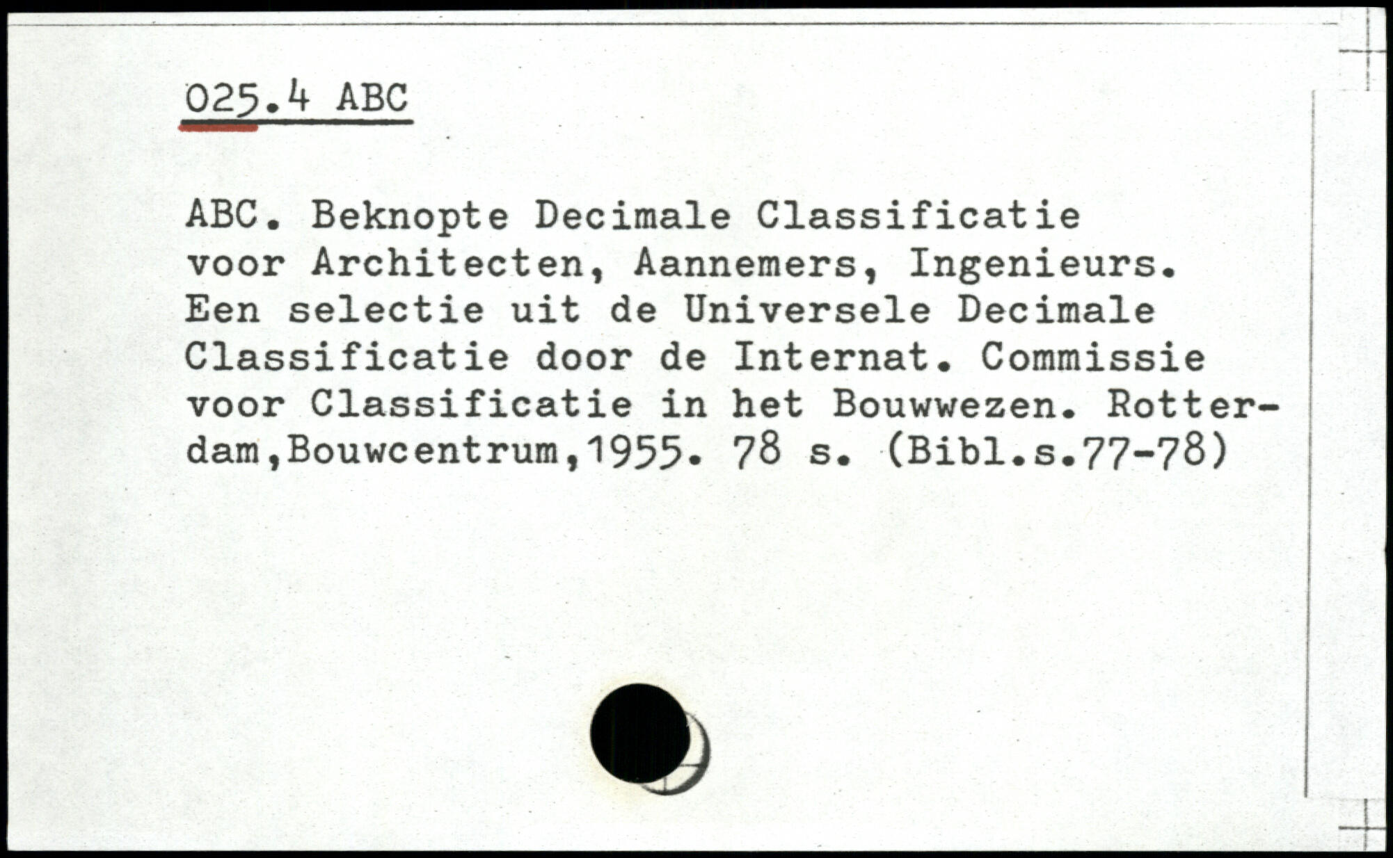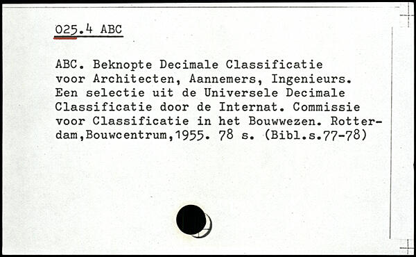ABC. Beknopte Decimale Classificatie voor Architecten, Aannemers, Ingenieurs. Een selectie uit de Universele Decimale Classificatie door de Internat. Commissie voor Classificatie in het Bouwwezen.