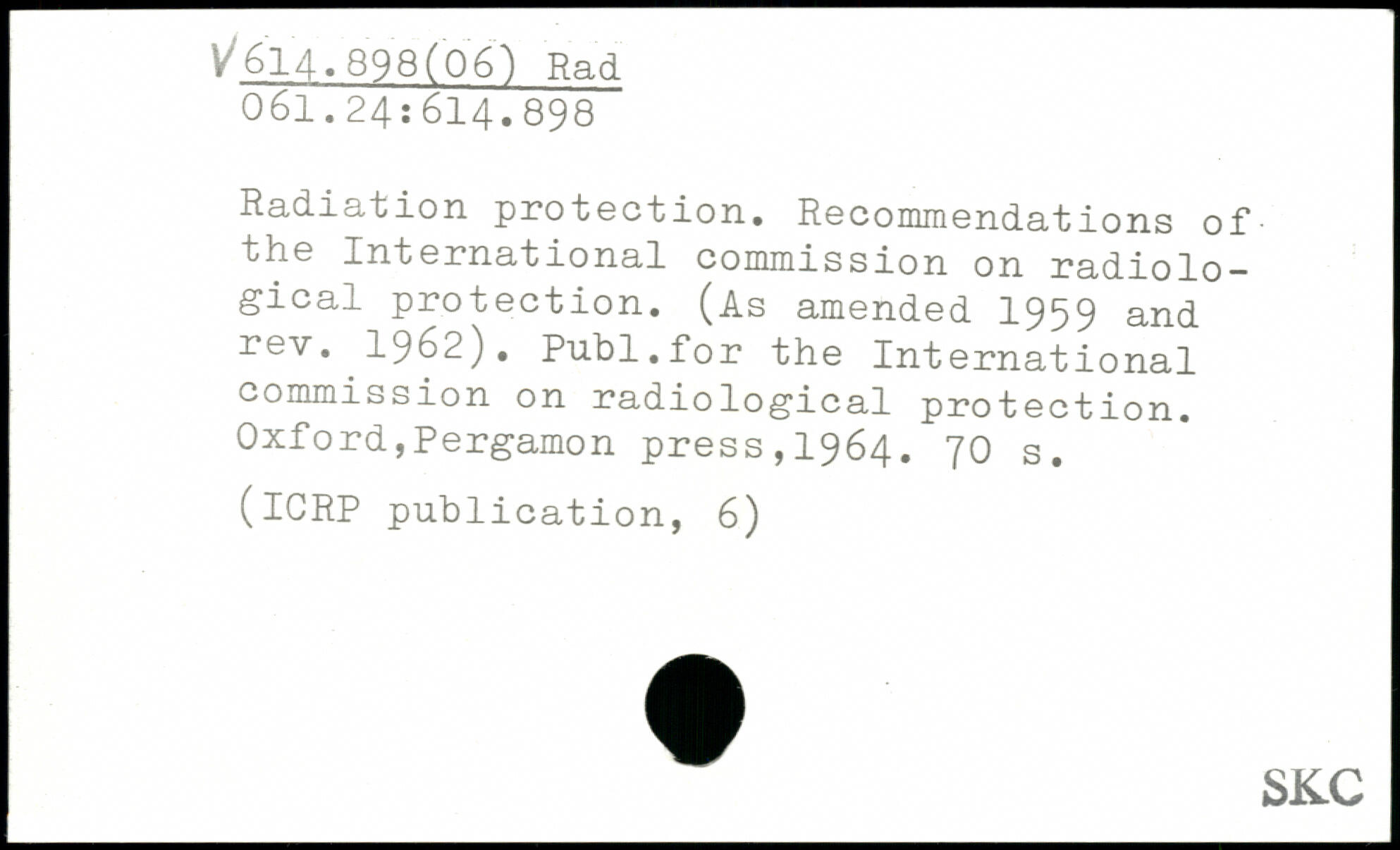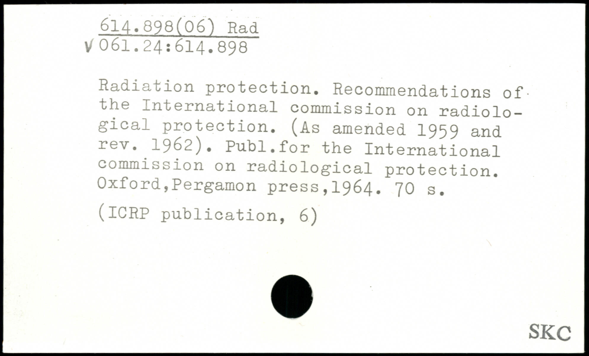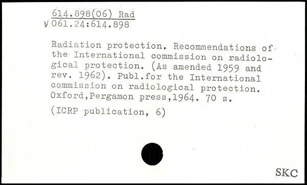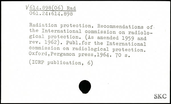 Radiation protection. Recommendations of the International commission on radiological protection. (As amended 1959 and rev. 1962). Publ.for the International commission on radiological protection.