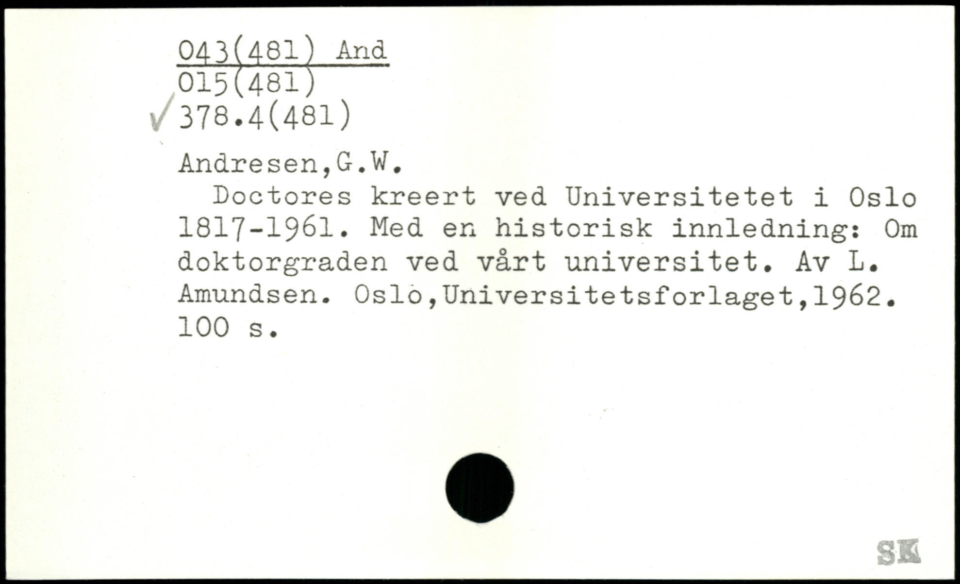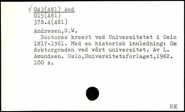 Doctores kreert ved Universitetet i Oslo 1817-1961. Med en historisk innledning: Om doktorgraden ved vårt universitet. Av L. Amundsen.