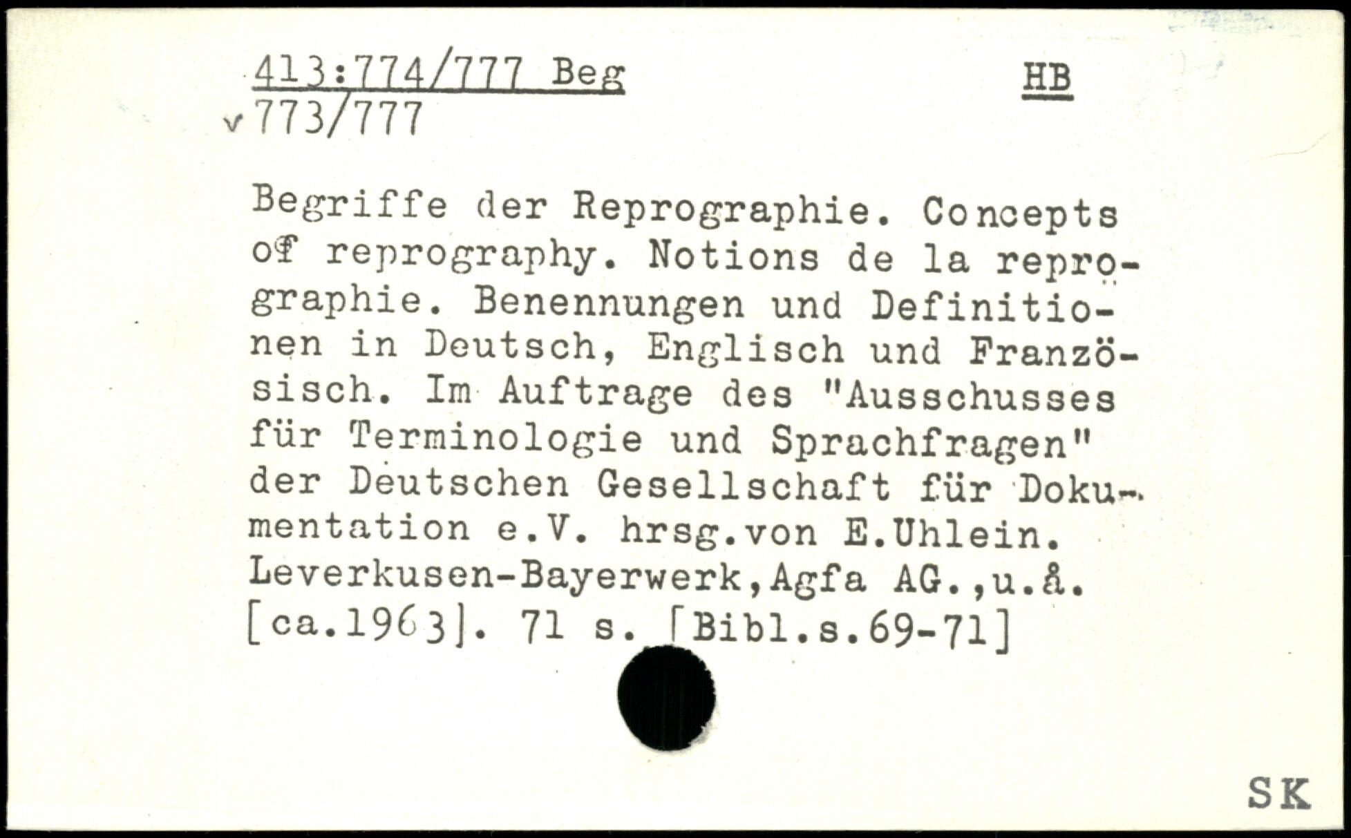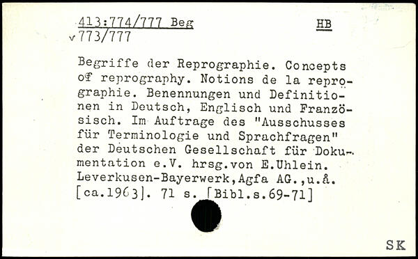 Begriffe der Reprographie. Concepts of reprography. Notions de la reprographie. Benennungen und Definitionen in Deutsch, Englisch und Französisch. Im Aufträge des "Ausschusses für Terminologie und Sprachfragen" der Deutschen Gesellschaft für Dokumentation e.V. hrsg.von E.Uhlein. Leverkusen-Bayerwerk,Agfa AG.,u.A.