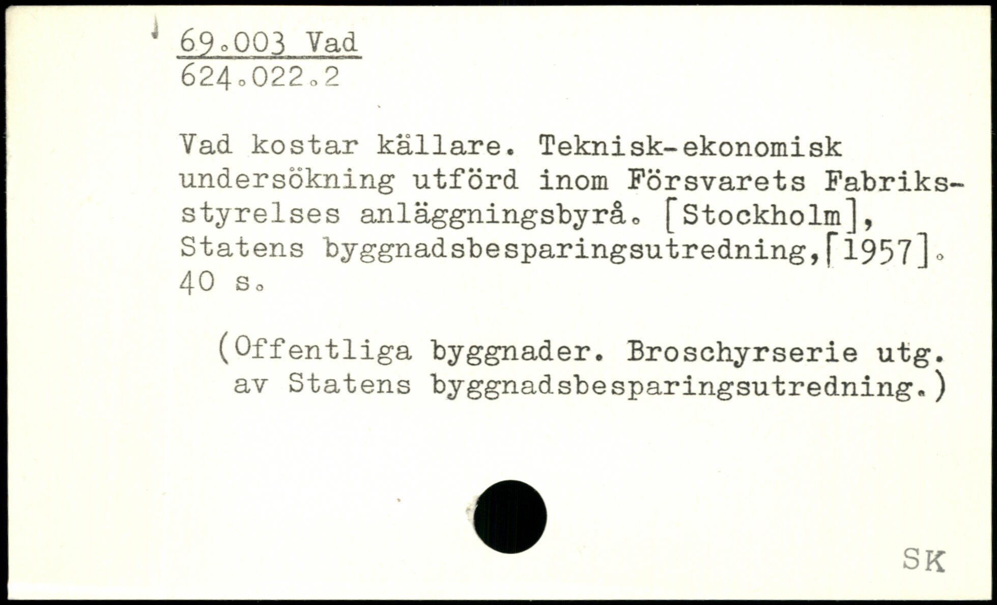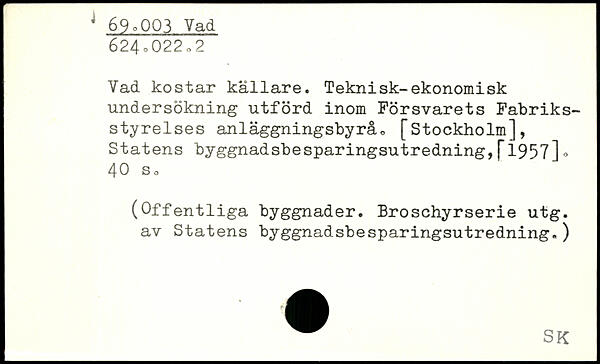 Vad kostar källare. Teknisk-ekonomisk undersökning utförd inom Forsvarets Fabriksstyrelses anläggningsbyrå. [Stockholm], Statens byggnadsbesparingsutredning,[1957]-