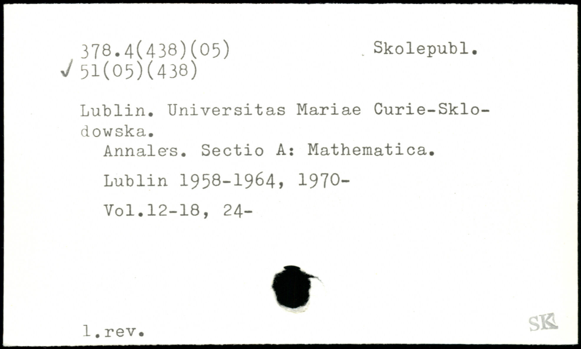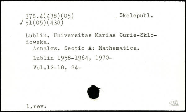 Lublin. Universitas Mariae Curie-Sklo-dowska. Annalcs. Sectio A: Mathematica. Lublin 1958-1964, 1970-