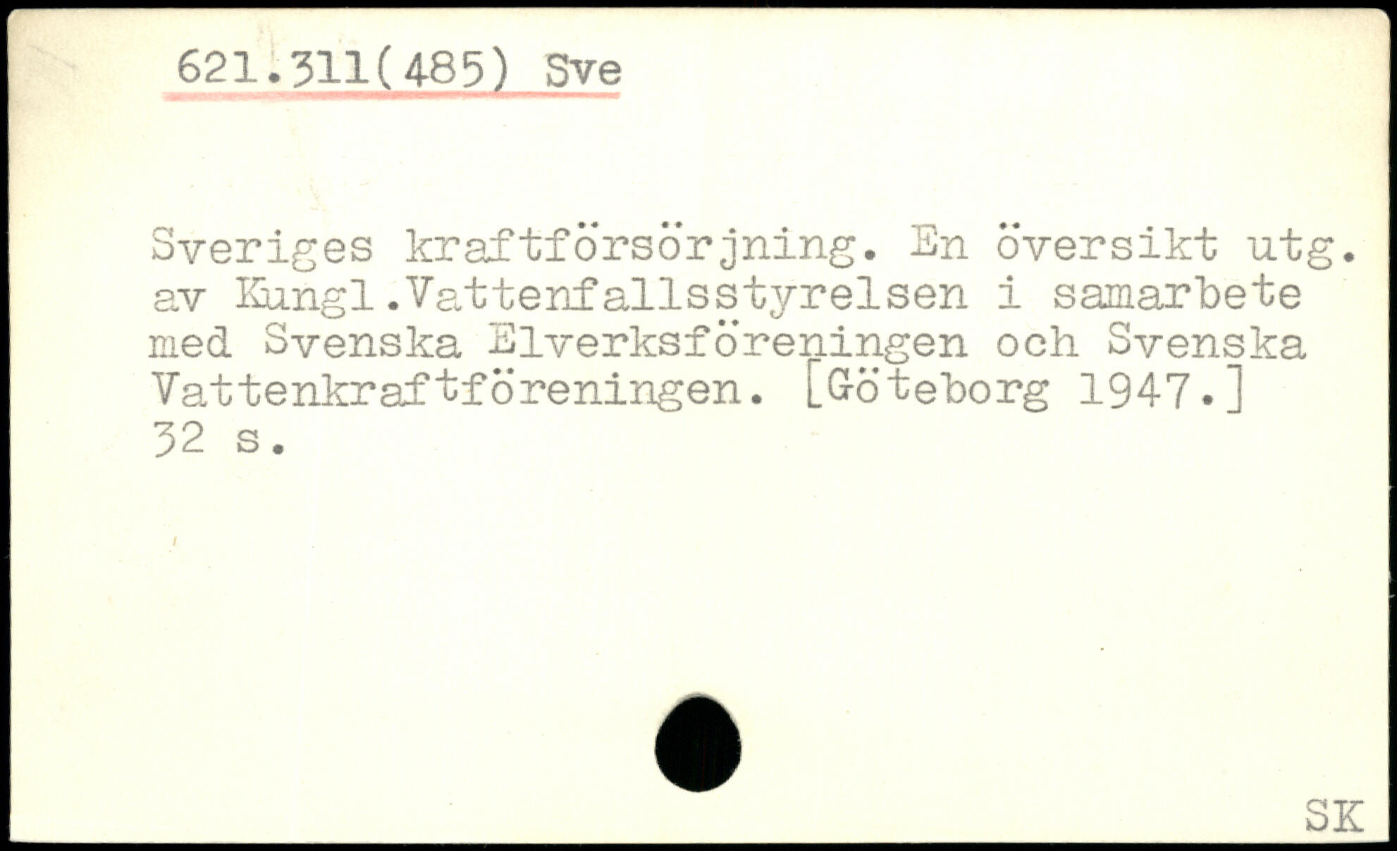 Sveriges kraftförsörjning. En översikt utg. av Iiimgl .Vattenfallsstyrelsen i samarbete med Svenska Elverksföreningen och Svenska Vattenkraftföreningen. [döteborg 1947.]