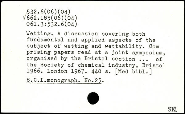 Wetting. A discussion covering both fundamental and applied aspects of the subject of wetting and wettability. Comprising papers read at a joint symposium, organised by the Bristol section ... of the Society of chemical industry, Bristol 1966.
