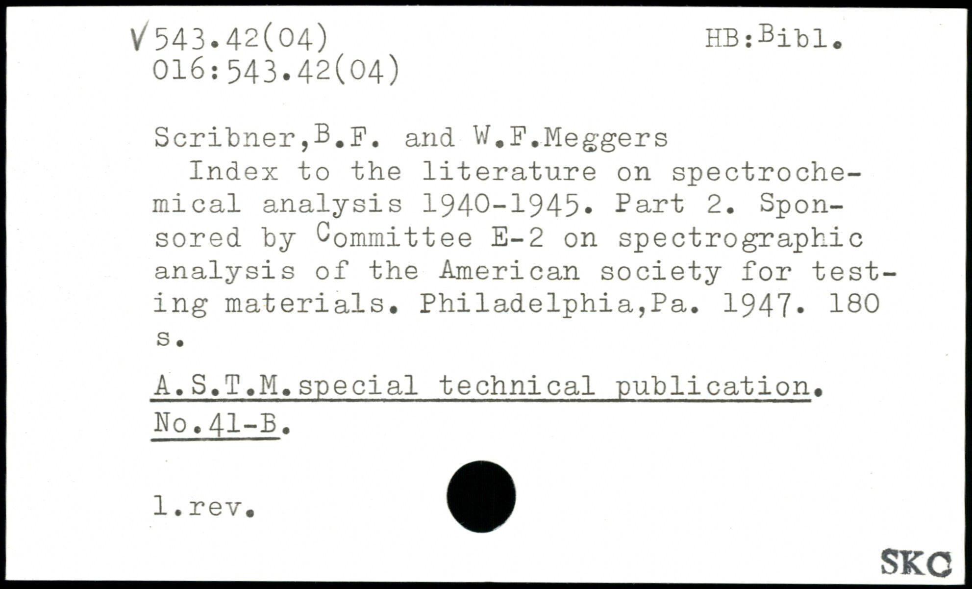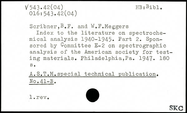 Index to the literature on spectroche-mical analysis 1940-1945, fart 2. Sponsored by Committee E-2 on spectrographic analysis of the American society for testing materials. Philadelphia,Pa. 1947.