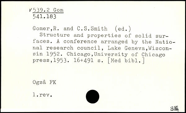 Structure and properties of solid surfaces. A conference arranged by the National research council, Lake Geneva,Wisconsin 1952.