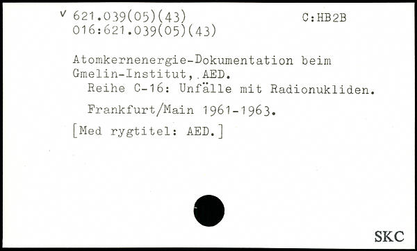 Atomkernenergie-Dokumentation beim Gmelin-Institut,.AED. Reihe C—16: Unfälle mit Radionukliden. Frankfurt/Main 1961-1963.