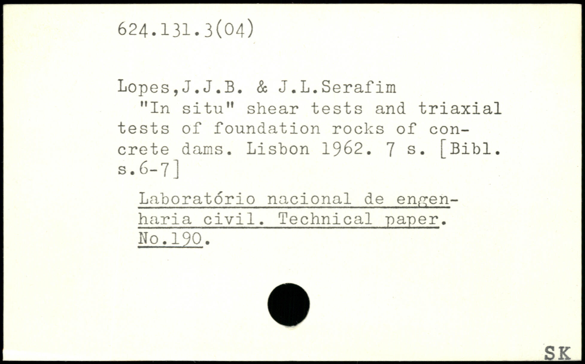 MIn situ" shear tests and triaxial tests of foundation rocks of concrete dams. Lisbon 1962.