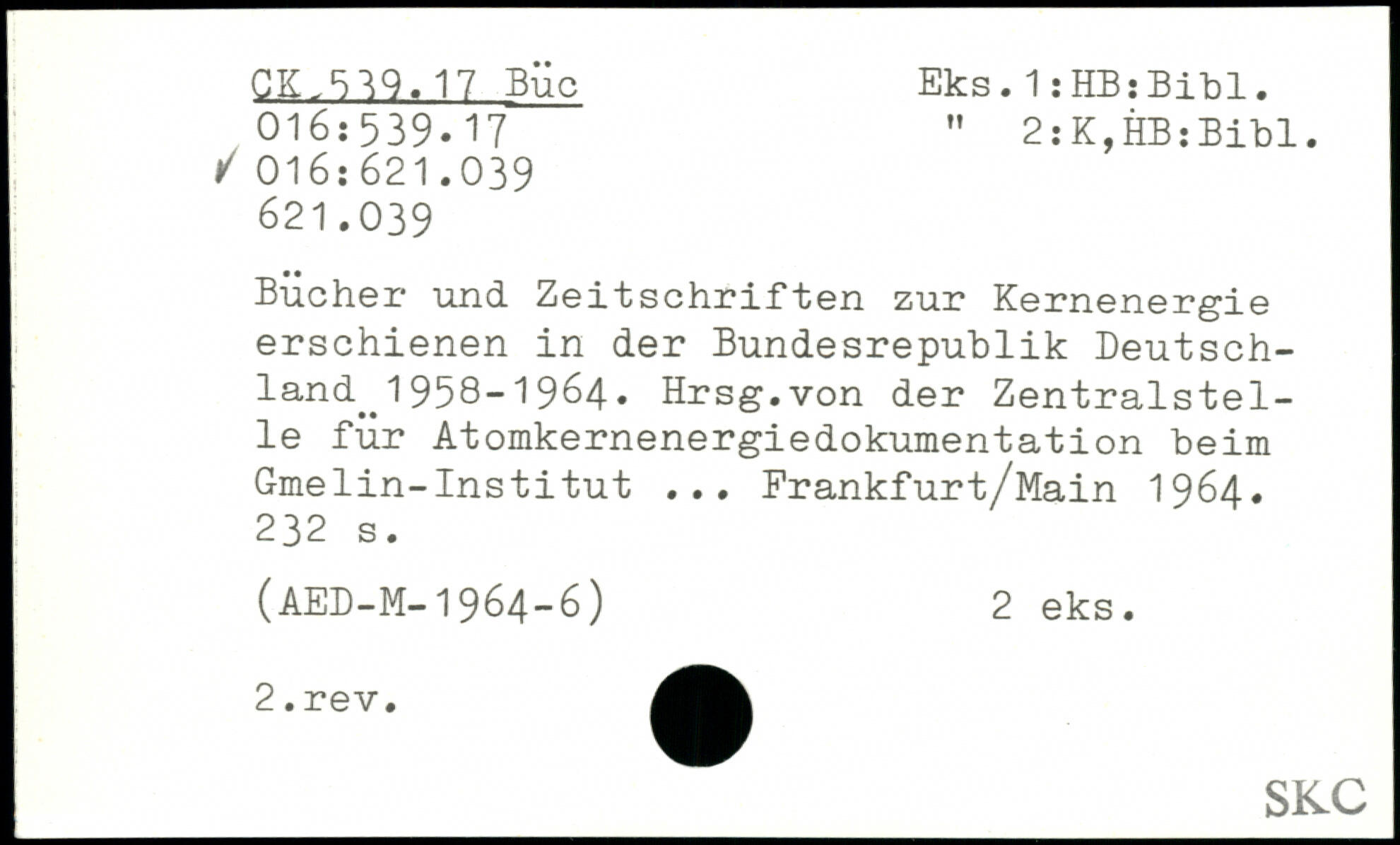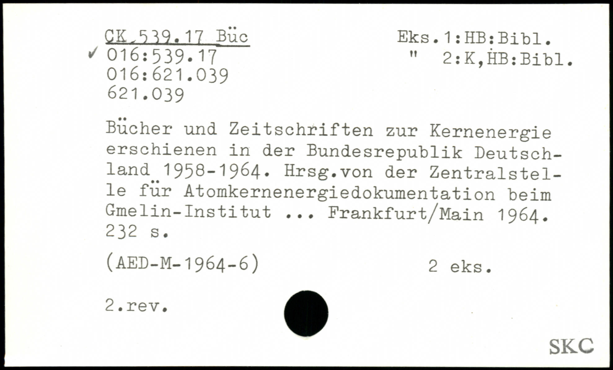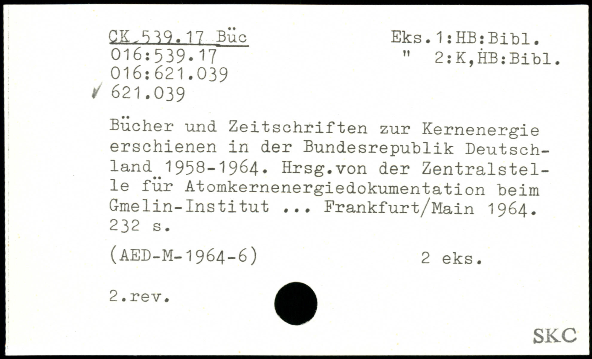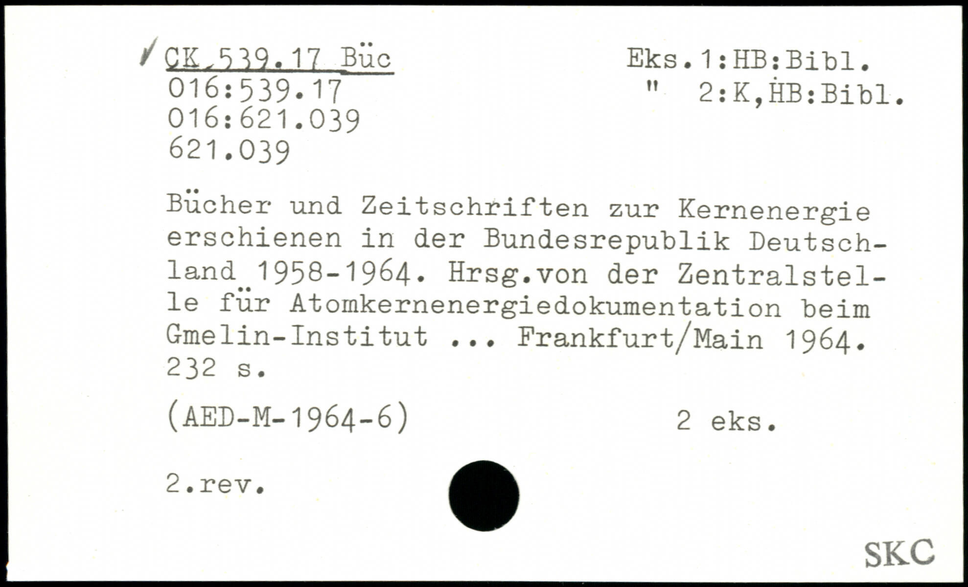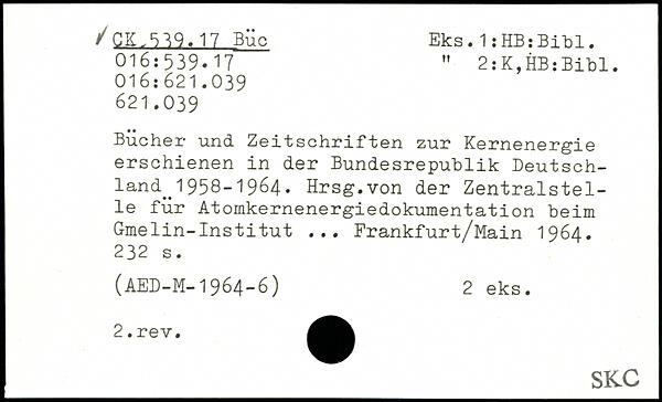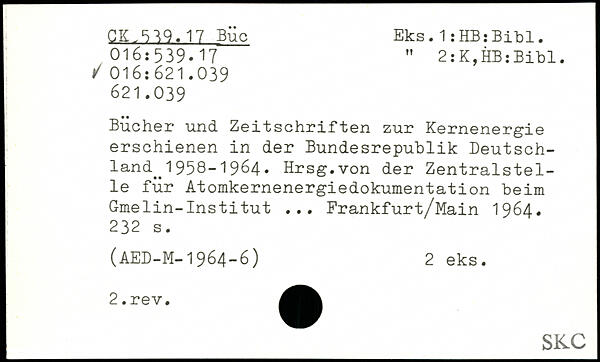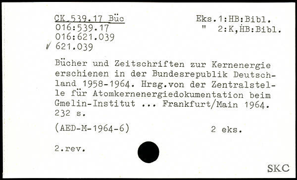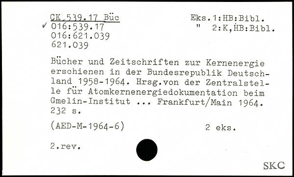 Bücher und Zeitschriften zur Kernenergie erschienen in der Bundesrepublik Deutschland^ 1958-1964. Hrsg.von der Zentralstelle für Atomkernenergiedokumentation beim Gmelin-Institut ... Frankfurt/Main 1964.