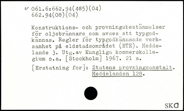 Konstruktions- och provningsbestämmelser för oljebrännare som avses att typgodkännas. Regler för typgodkännande verksamhet på eldstadsområdet (RTE). Meddelande 3. Utg.av Kungliga kommerskollegium o.a.
