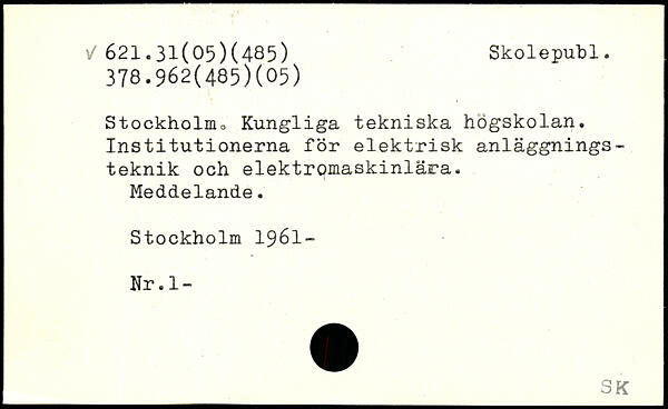 Stockholm. Kungliga tekniska högskolan. Institutionerna för elektrisk anläggningsteknik och elektromaskinlära. Meddelande.