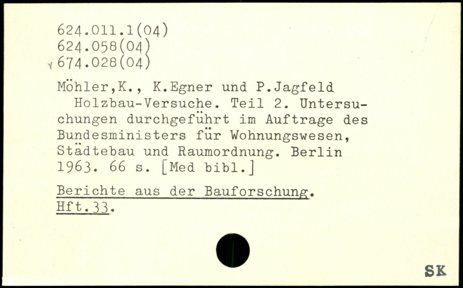 Möhler,K., K.Egner und P.Jagfeld Holzbau-Versuche. Teil 2. Untersuchungen durchgefuhrt im Aufträge des Bundesministers für Wohnungswesen, Städtebau und Raumordnung.