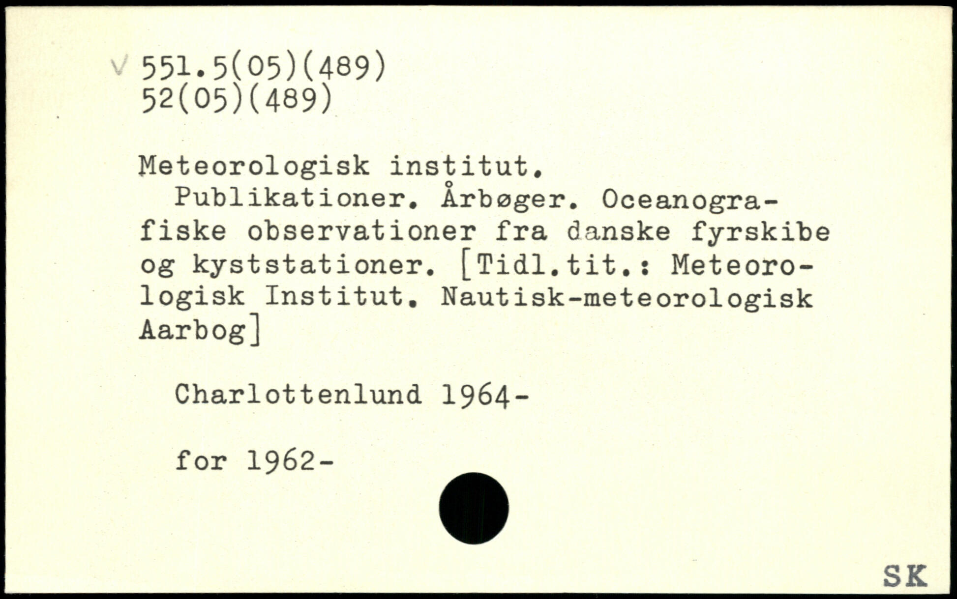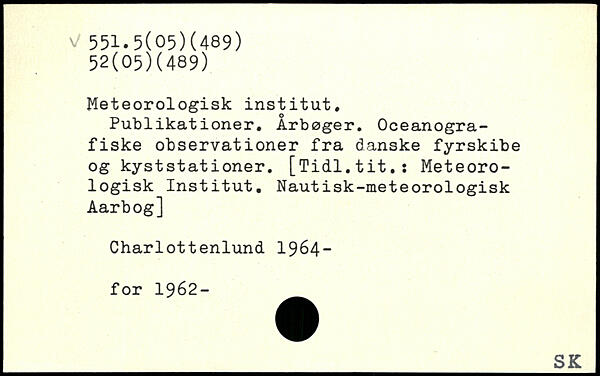 Meteorologisk institut. Publikationer. Arbøger. Oceanografiske observationer fra danske fyrskibe og kyststationer. [Tidl.tit.: Meteorologisk Institut. Nautisk-meteorologisk Aarbog] Charlottenlund. 1964-for 1962-