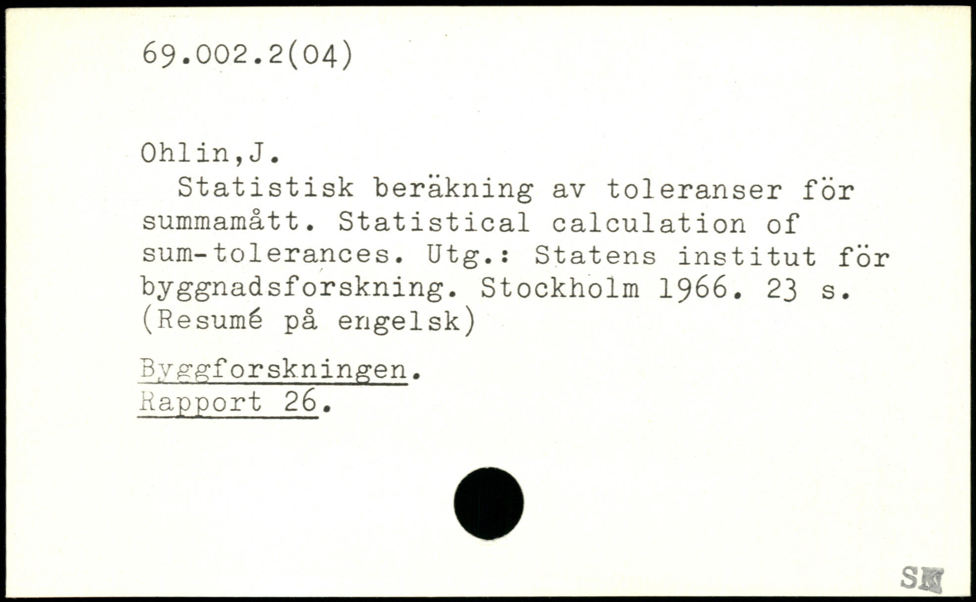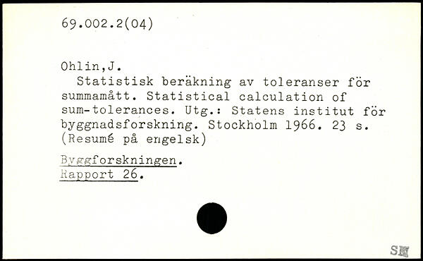 Statistisk beräkning av toleranser för summamått. Statistical calculation of sum-tolerances. Utg.: Statens institut för byggnadsforskning.