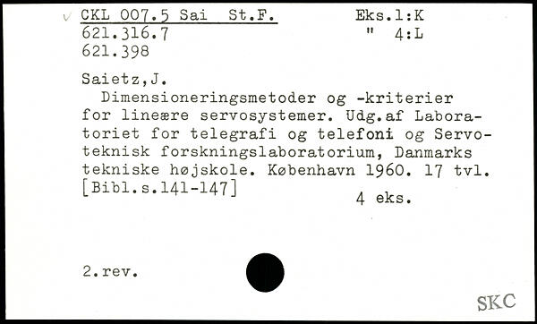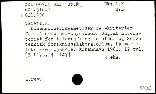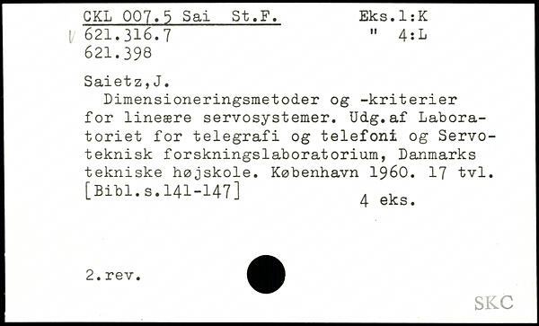 Dimensioneringsmetoder og -kriterier for lineære servosystemer. Udg.af Laboratoriet for telegrafi og telefoni og Servo-teknisk forskningslaboratorium, Danmarks tekniske højskole.